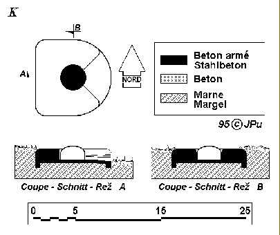 Belgické opevnění z druhé světové války, opevněná pozice Lutychu, první obranná linie, tvrz Aubin-Neufchâteau. Nepodařilo se mi najít žádné archivní fotografie týkající se objektu K. Přesto měl svůj strategický a taktický význam. Šlo o malý objekt bez základů vybavený plechovou kopulí, přesnou kopii zvonů pro těžké kulomety. Tento objekt neměl ani místnosti, ani výzbroj. Nebyla tedy žádná komunikace s tvrzí. Nicméně v podzemí objektu B1 existuje náčrt galerie uzavřený pancéřovými dveřmi. Během bojů byl objekt K napaden puškami, kulomety a lehkým dělem. Jeho kopule je proražena velmi četnými zásahy. Nepřítel tam tedy promarnil značné množství munice. Je pravděpodobné, že tvrz odpověděla salvou minometných min na každý útok na objekt K, aby udržela co nejdéle svůj čistě odstrašující účinek. Těžce poškozená končí svůj život před vchodovým objektem. Plán objektu má malý význam, ale přesto jej zveřejňuji. Samozřejmě, že žádný muž nebyl přidělen tomuto fantomovému objektu a jen několik zasvěcených vědělo, že za pancéřovými dveřmi není žádná galerie, stejně jako velmi málo zasvěcených vědělo o nouzovém východu u pozorovacího objektu O. Mimochodem, v této souvislosti mě desátník Mathieu Nibus, bývalý příslušník tvrze, ujišťoval až do svého posledního dechu, že tento východ neexistuje, zatímco právě tam jsme vstoupili do PO. Ale to je jiný příběh. Každopádně němečtí pionýři promarnili stovky, ne-li tisíce, nábojů, aby nedosáhli nic jiného než stovky děr v 2 mm silném plechu.