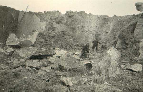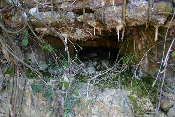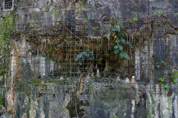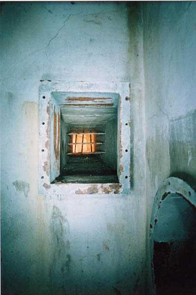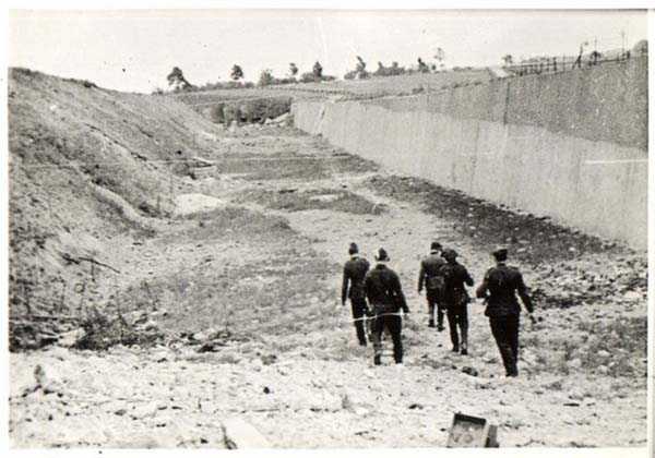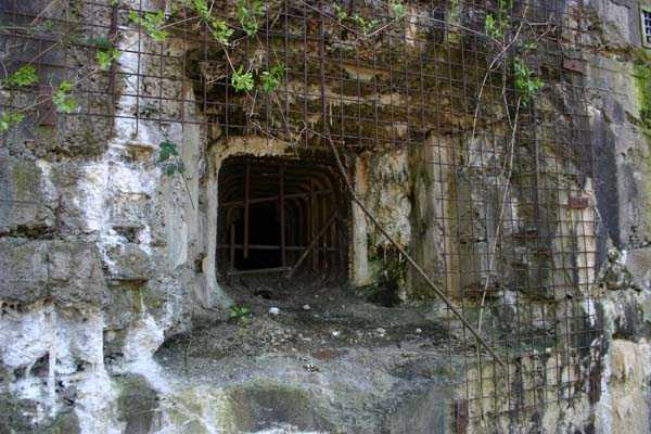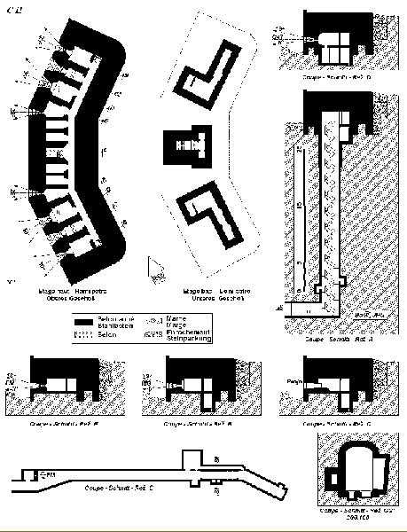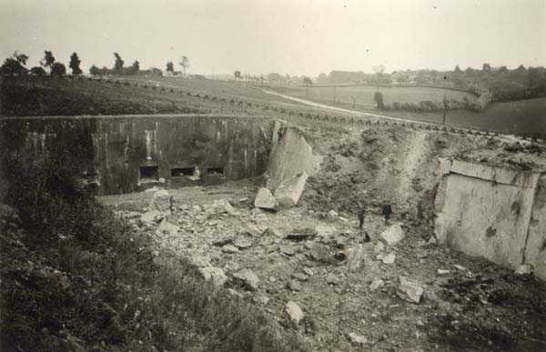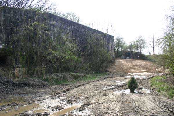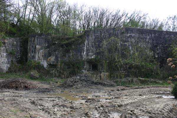 Belgian fortification of the Second World War, fortified position of Liège, first line of resistance, fort of Aubin-Neufchâteau. The faces exposed to enemy blows and the roof have a thickness of 3.50 m. The face pierced by embrasures measures 2.50 m thick. The double counterscarp cofferdam (C2), at the foot of turret B2, barred the ditches connecting the artillery block B2 on one hand with the artillery block B1 and on the other hand with the entrance block B3. This cofferdam had two divergent firing facades each pierced by a loophole for a 47 mm anti-tank gun, a loophole for a double Maxim machine gun on reversible mount, a loophole for a 30 cm searchlight and a loophole for a machine gun to ensure close defense. The flanking is provided by one of the machine gun cupolas of artillery block B2. During the occupation of the fort by Germany and more particularly during the winter of 1941-1942, this cofferdam was the subject of experimental firing tests with numerous Röchling shells in flat trajectory fire. The shells of 165 mm caliber demonstrated little effectiveness except on thin concrete thicknesses, such as against the shaft walls, the shells of 5 cm caliber on the other hand pierced the entire roof thickness. Currently, the cofferdam is no longer accessible by its underground gallery following the demolition carried out on the order of the commander during the fighting of May 1940 which saw the destruction of the right 47 mm loophole by a hollow charge killing two men. Access from above is particularly perilous, the shaft being gaping and stripped of its metal stairs by the post-war scrapping. There is no armament on the roof.