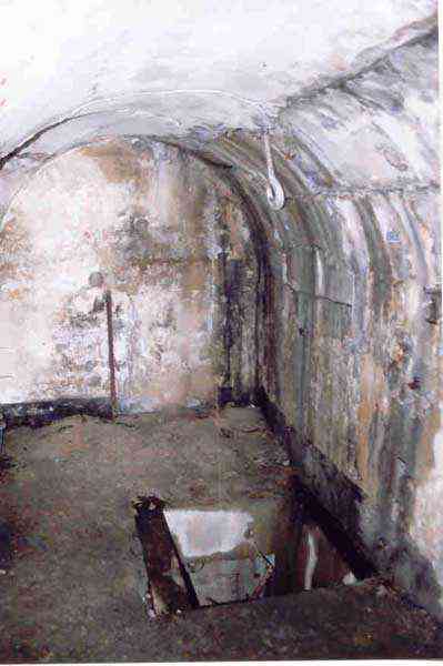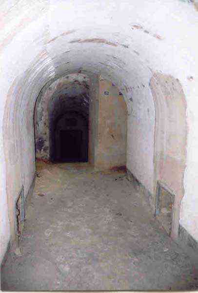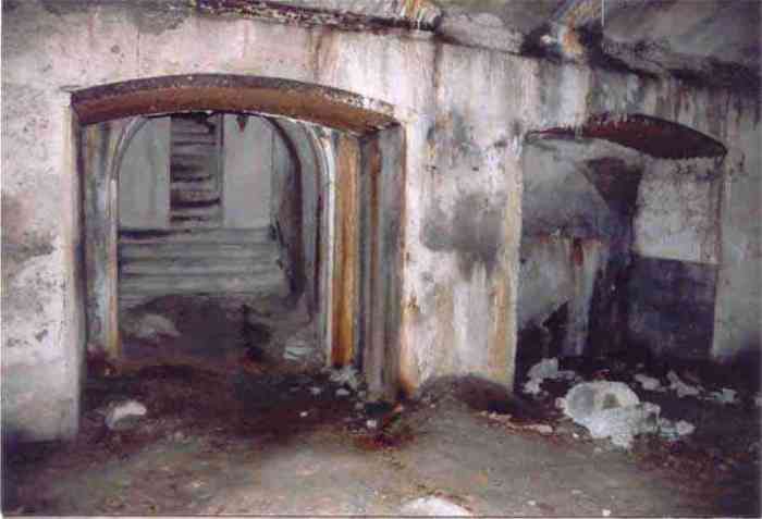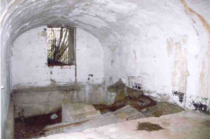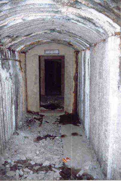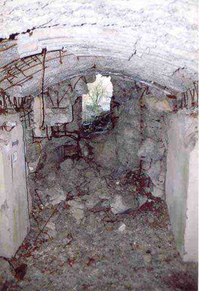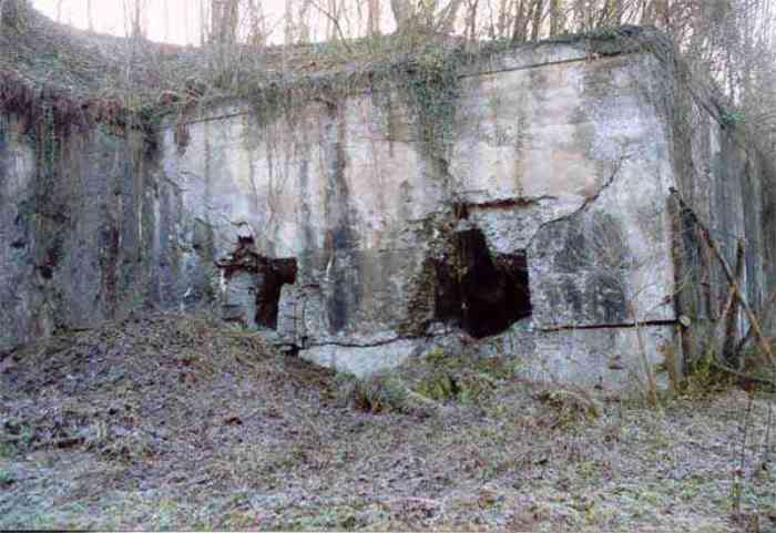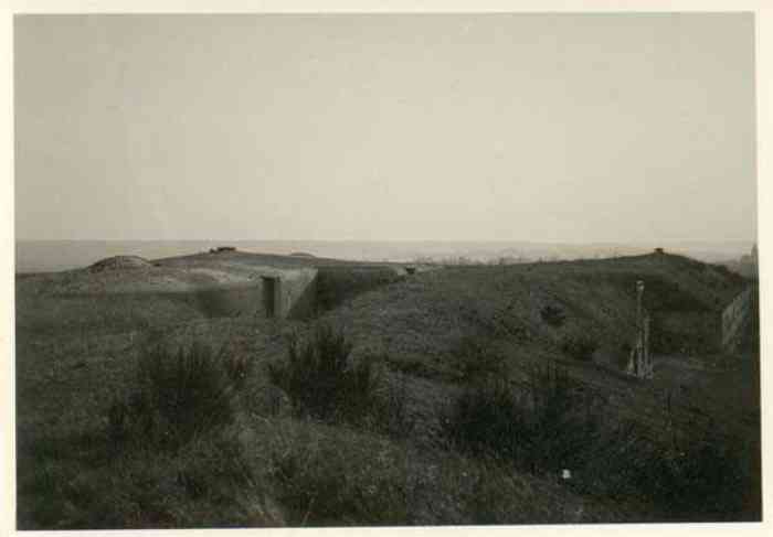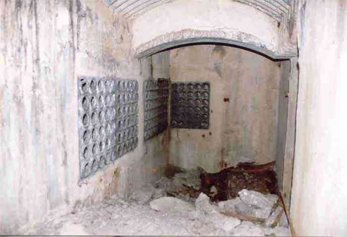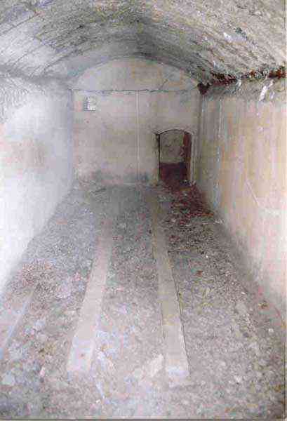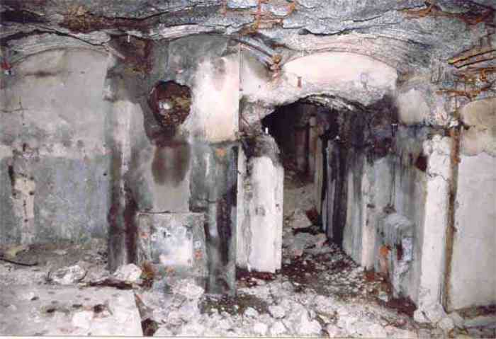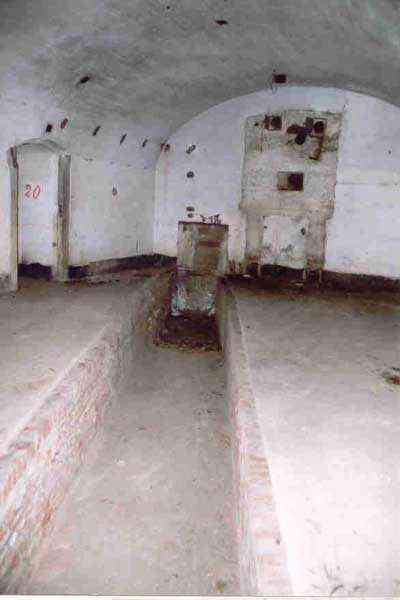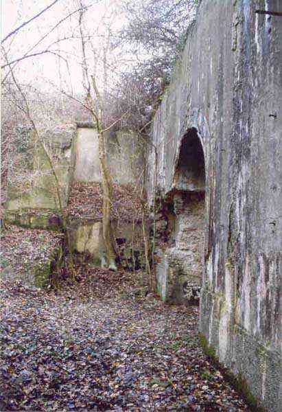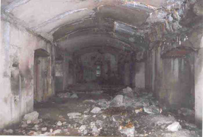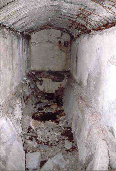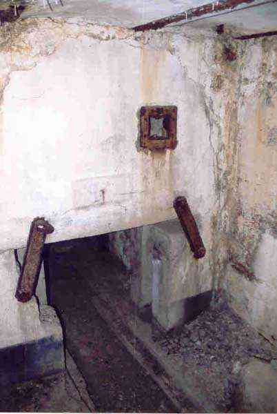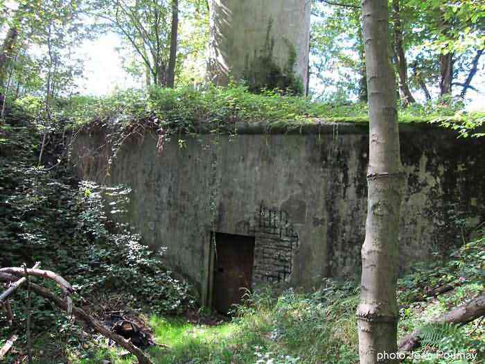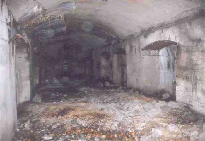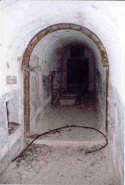 Fortified Position of Namur, fort belt, Fort Andoy, east-southeast of the city, 1888-1892. 223 m/asl. Armament in 1914: 1 cupola 2 x 15 cm, 2 cupolas 1 x 21 cm, 2 cupolas 2 x 12 cm, 4 turrets 1 x 5.7 cm, 1 armored searchlight, 8 cannons 5.7 cm for flanking. This is a large triangular fort with a wide curtain wall at the gorge. It is the only fort on the Meuse that, during the combats of 1914, had to deplore the death of an officer: Lieutenant TASNIER hit in the head by a shell splinter that passed under the vault of a dormitory window in the gap left by the beam barrier. Andoy is reputed to have been targeted between 22 and 24 August 1914 by, according to sources, 450 to 600 305 mm shells. In fact, the Germans carried out extensive consolidation work there, notably the assembly room whose flanks were clad with concrete walls one meter thick. Despite the rearmament of the interwar period, the German modifications are still very visible, such as the airlocks in the escarp circulation corridor or the singular air intake trench in the same corridor at salient III. The most notable modifications due to rearmament are: a shallow quadrilateral; an endless air gallery, nearly 1,200 m long; air distribution hatches located very low in a trench next to the fan base, some wall frescoes in the TTR room grafted onto the air gallery, a hoist for 75 mm shells, of the Namur type (as opposed to the models of the rearmed Liège forts), three-quarters buried at salient I. Some rooms are completely devastated, such as the firing chambers of the casemates, the decontamination room and, generally, all those of the counterscarp. This fort is singularly poor in wall inscriptions, except in two rooms of the left half-escarp at the gorge. Private property (01/2006).