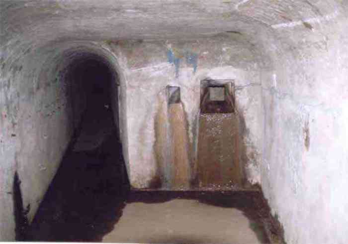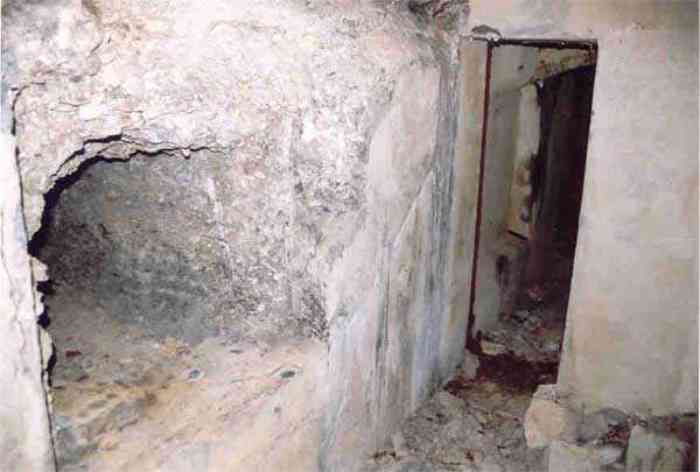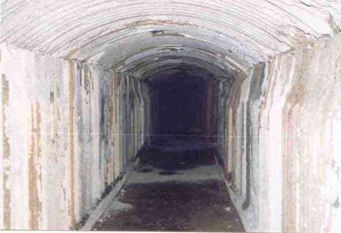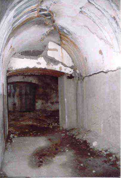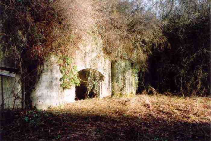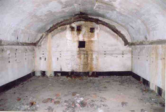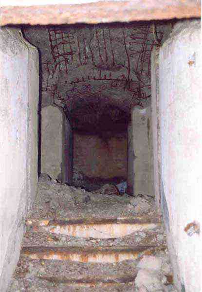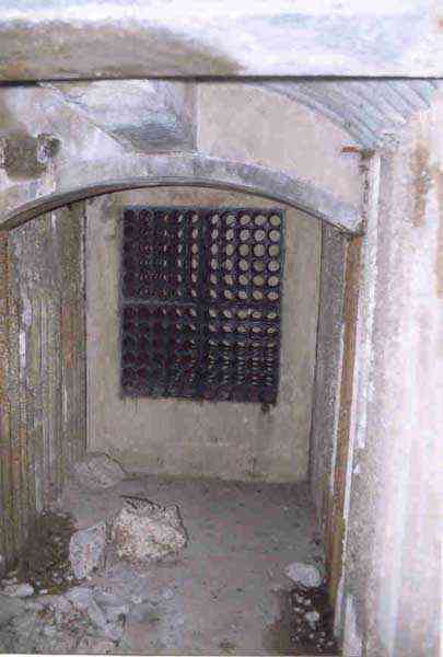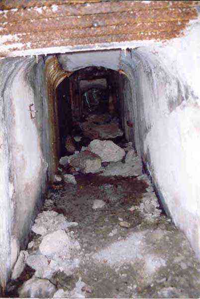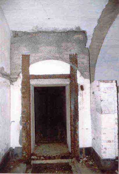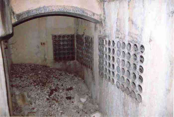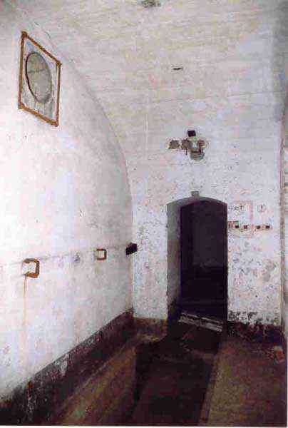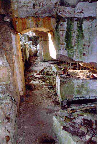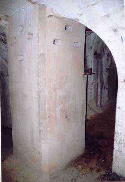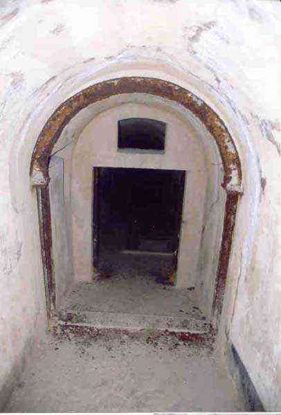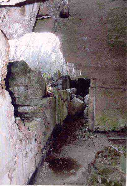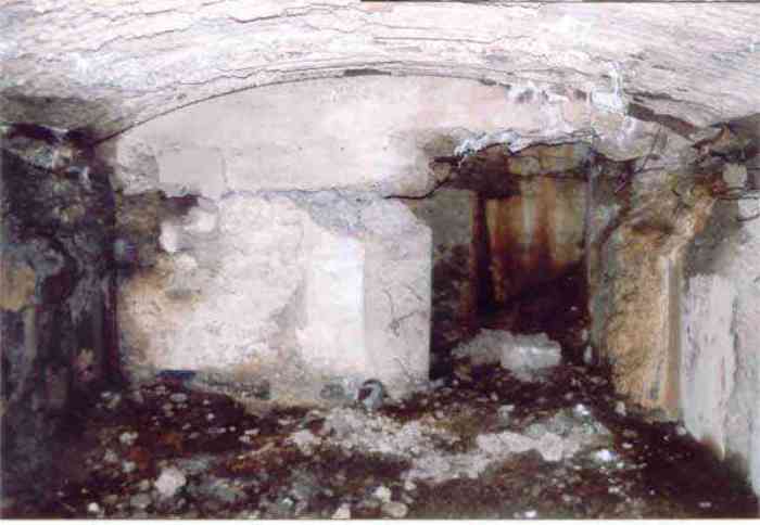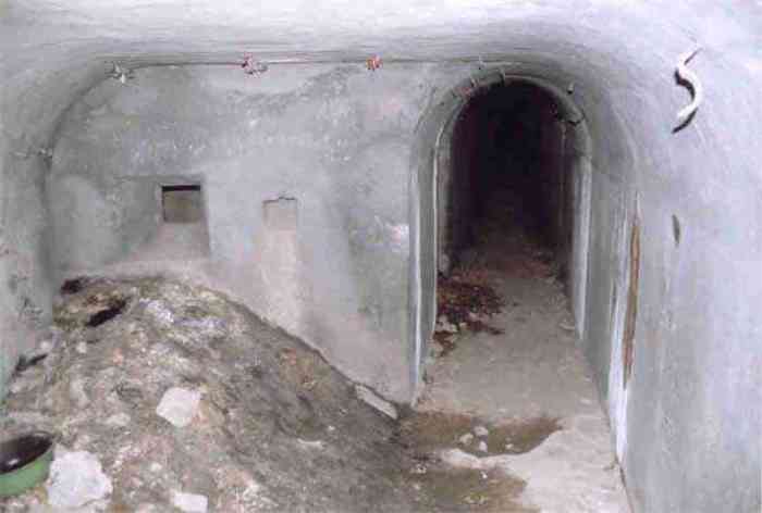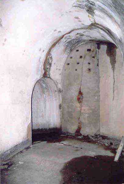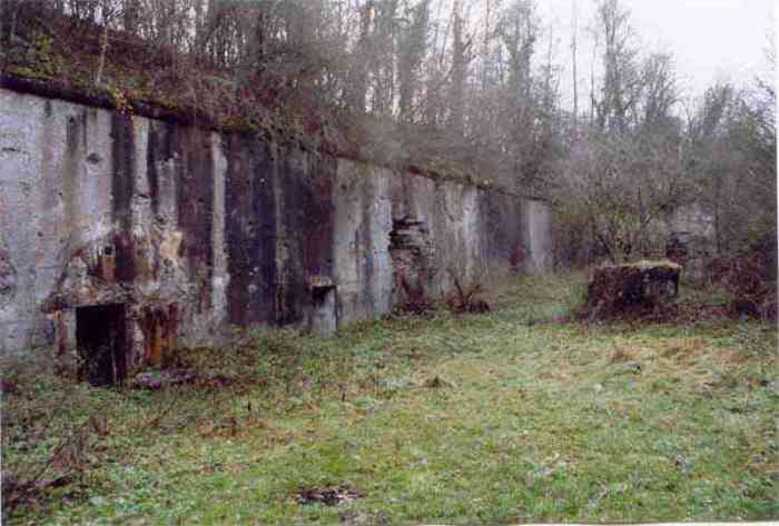 Fortified Position of Namur, fort belt, Fort Andoy, east-southeast of the city, 1888-1892. 223 m/asl. Armament in 1914: 1 cupola 2 x 15 cm, 2 cupolas 1 x 21 cm, 2 cupolas 2 x 12 cm, 4 turrets 1 x 5.7 cm, 1 armored searchlight, 8 cannons 5.7 cm for flanking. This is a large triangular fort with a wide curtain wall at the gorge. It is the only fort on the Meuse that, during the combats of 1914, had to deplore the death of an officer: Lieutenant TASNIER hit in the head by a shell splinter that passed under the vault of a dormitory window in the gap left by the beam barrier. Andoy is reputed to have been targeted between 22 and 24 August 1914 by, according to sources, 450 to 600 305 mm shells. In fact, the Germans carried out extensive consolidation work there, notably the assembly room whose flanks were clad with concrete walls one meter thick. Despite the rearmament of the interwar period, the German modifications are still very visible, such as the airlocks in the escarp circulation corridor or the singular air intake trench in the same corridor at salient III. The most notable modifications due to rearmament are: a shallow quadrilateral; an endless air gallery, nearly 1,200 m long; air distribution hatches located very low in a trench next to the fan base, some wall frescoes in the TTR room grafted onto the air gallery, a hoist for 75 mm shells, of the Namur type (as opposed to the models of the rearmed Liège forts), three-quarters buried at salient I. Some rooms are completely devastated, such as the firing chambers of the casemates, the decontamination room and, generally, all those of the counterscarp. This fort is singularly poor in wall inscriptions, except in two rooms of the left half-escarp at the gorge. Private property (01/2006).