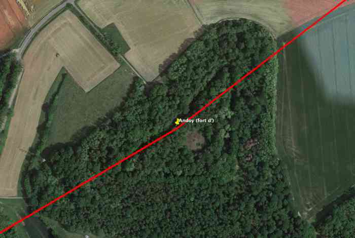 Opevněná pozice Namur, pás pevností, pevnost Andoy, východojihovýchodně od města, 1888-1892. 223 m/n. m. Výzbroj v roce 1914: 1 kopule 2 x 15 cm, 2 kopule 1 x 21 cm, 2 kopule 2 x 12 cm, 4 věžičky 1 x 5,7 cm, 1 pancéřový světlomet, 8 kanónů 5,7 cm pro flankování. Jedná se o velkou trojúhelníkovou pevnost s širokou kurtinou v krku. Je to jediná pevnost na Máze, která během bojů v roce 1914 musela oplakávat smrt důstojníka: poručíka TASNIERA, zasaženého do hlavy střepinou granátu, který pronikl pod klenbu okna ubikace ve spáře ponechané zábranou z nosníků. Andoy měl být mezi 22. a 24. srpnem 1914 zasažen podle zdrojů 450 až 600 granáty ráže 305 mm. Němci zde skutečně provedli rozsáhlé konsolidační práce, zejména shromažďovací místnost, jejíž boky byly obloženy metr silnými betonovými stěnami. Navzdory přezbrojení v meziválečném období jsou německé úpravy stále velmi patrné, jako jsou přechodové komory v komunikační chodbě eskarpy nebo podivný přívodní vzdušný kanál v téže chodbě u salientu III. Nejvýraznější úpravy způsobené přezbrojením jsou: mělký čtyřúhelník; nekonečná vzdušná galerie dlouhá téměř 1 200 m; poklopy pro rozvod vzduchu umístěné velmi nízko v příkopu vedle patky ventilátoru, několik nástěnných fresek v místnosti TTR připojené ke vzdušné galerii, nákladní výtah pro granáty ráže 75 mm, typu Namur (na rozdíl od modelů přezbrojených pevností v Lutychu), ze tří čtvrtin zasypaný u salientu I. Některé místnosti jsou zcela zdevastovány, jako palebné místnosti kasemat, dekontaminační místnost a obecně všechny místnosti kontreskarpy. Tato pevnost je nápadně chudá na nástěnné nápisy, s výjimkou dvou místností na levé poloviční eskarpě u krku. Soukromý majetek (01/2006).