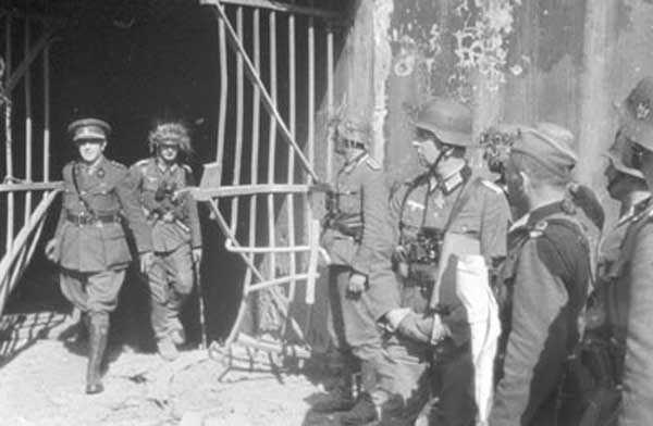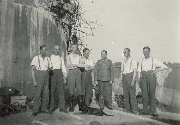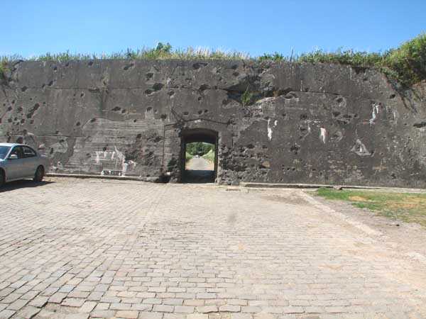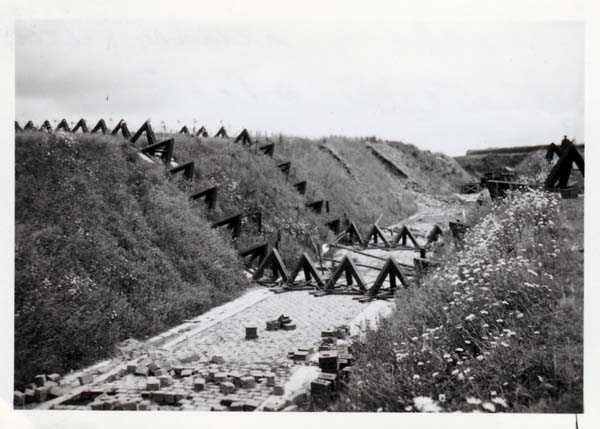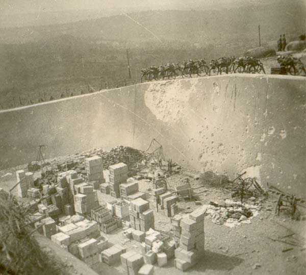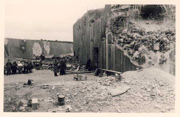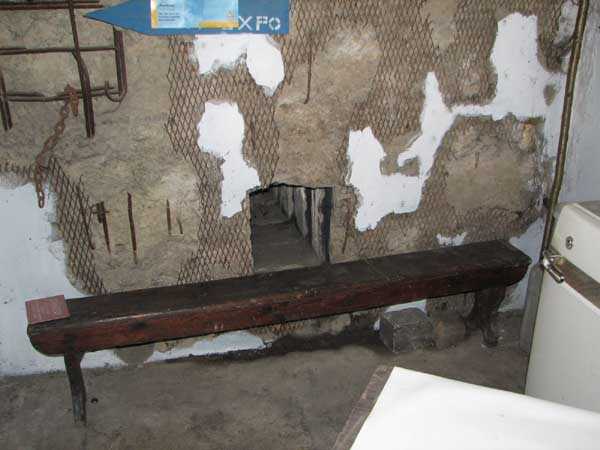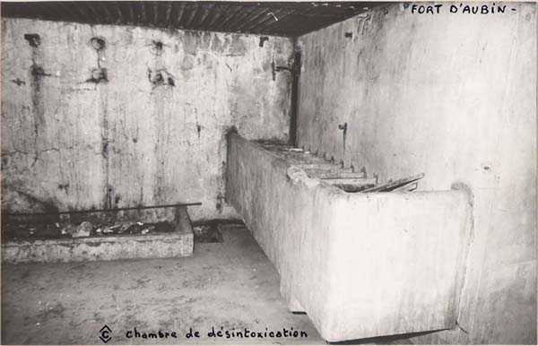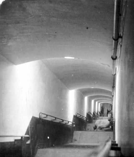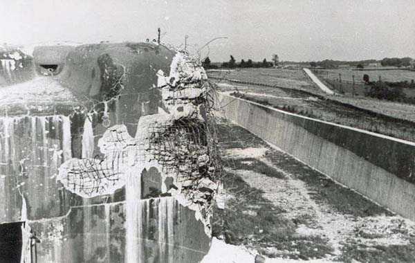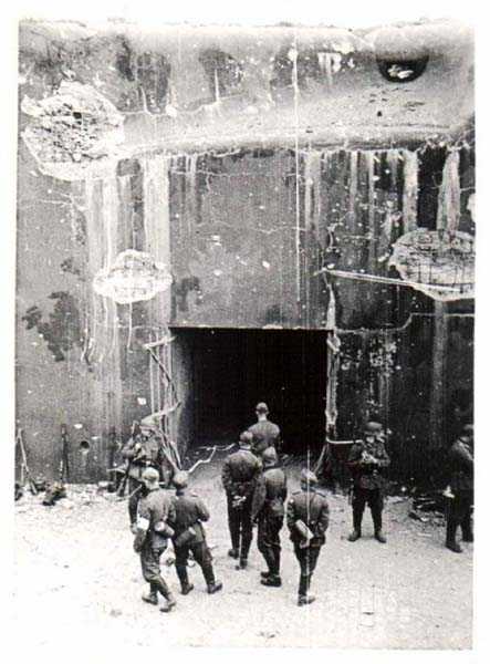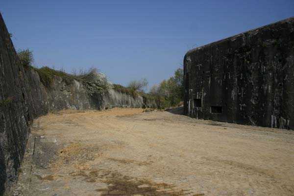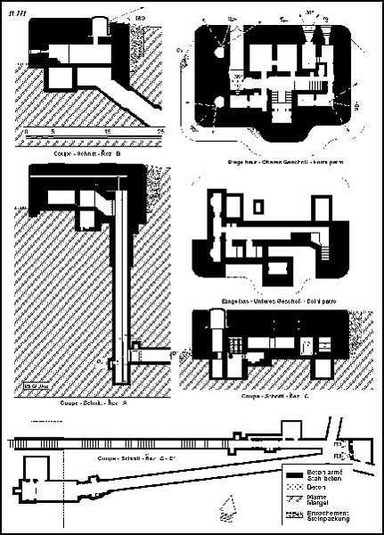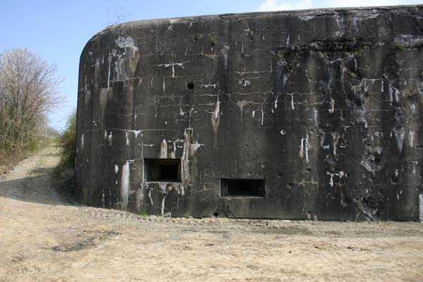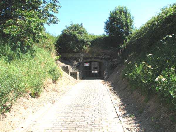 Belgian fortification of the Second World War, fortified position of Liège, first line of resistance, fort Aubin-Neufchâteau, peacetime entrance block B3. The entrance block is equipped on the roof with 3 cupolas with one embrasure for machine guns. Each time it is a double Maxim machine gun on reversible mount. The entrance block is itself also defended by a Maxim machine gun on reversible mount but installed in a casemate next to the projector room. The entrance is barred by a strong two-leaf grille, by a laterally rolling bridge that reveals a 4-meter deep haha, and by a machine gun in the guardhouse. Three hand grenade chutes complete the close defense equipment of this infantry block. The walls exposed to the enemy and the roof have a thickness of 3.5 meters. The facade wall, on the friendly side, has a thickness of 2.50 meters. The interior walls have a thickness of 1 meter and the floor slab is 50 centimeters thick. An airtight airlock prevents the penetration of combat gases and allows good pressurization of the entire combat block. This pressurization also has the advantage of evacuating weapon gases to the outside of the block. During the fighting, the entrance block was heavily engaged by an 88 mm gun that intended to pierce the cupola at the north-west angle of the block without however completely succeeding. Assigned to peacetime entrance block B3, although this is not an exclusive assignment, as they can also serve other posts depending on needs and their skills, there are 33 men officers, non-commissioned officers and soldiers, including…