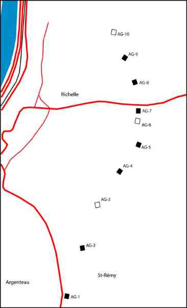 Position Fortifiée de Liège, troisième ligne de résistance, têtes de ponts. La tête de pont d'Argenteau se trouve sur la rive droite de la Meuse en avant de la ligne PL (Pontisse-Lixhe) sur les communes d'Argenteau et principalement de Richelle. Elle se compose de 8 abris légers de type PA renforcé et de 2 abris de contre-irruption soit un total de 10 abris dont au moins 3 sont détruits.