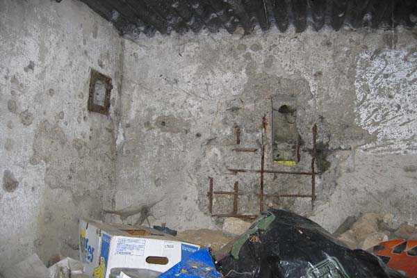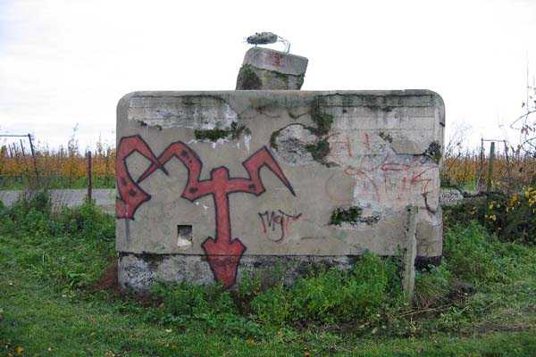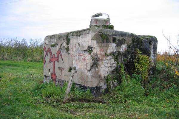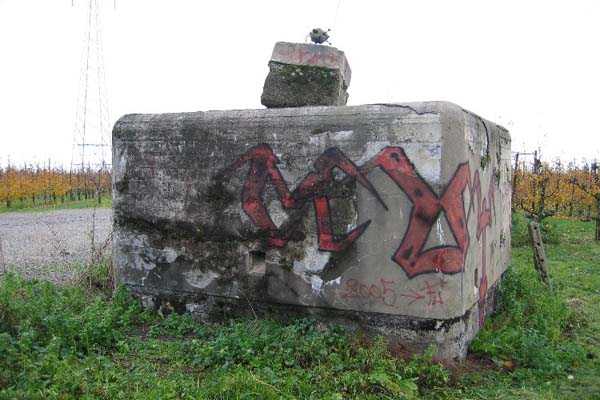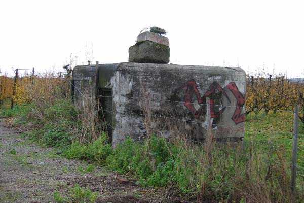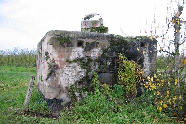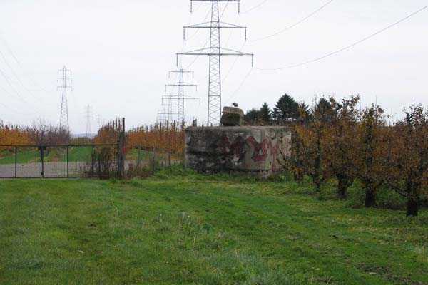 Fortified Position of Liège, third line of resistance, bridgeheads, Argenteau bridgehead, shelter Ag8, 134 m/asl. Located north of Rue de Richelle, in the middle of orchards, 300 m north-northeast of shelter Ag7, it is an atypical reinforced type PA shelter with the entrance in the middle of the face opposite the embrasure and with a strange appendage on its roof slab.