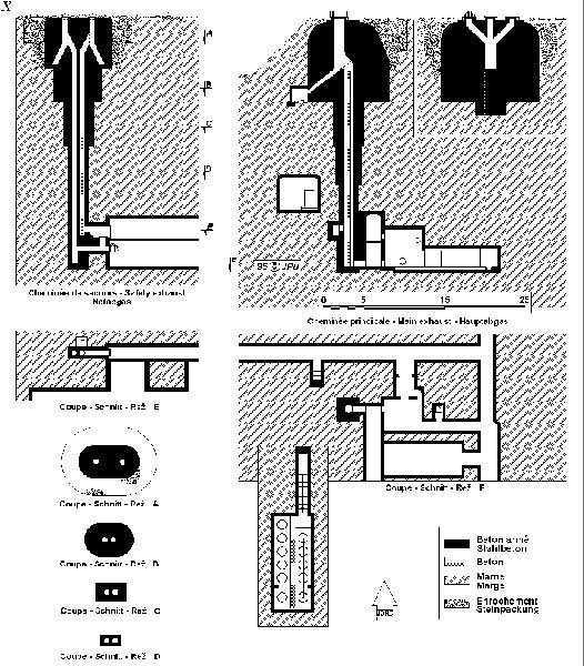 The chimneys served to evacuate the vitiated air coming from the men's breathing in the barracks and from the operation of the generator set engines. Each chimney block had two underground visitable vertical ducts of 60 cm diameter. The main block had three outlets, the emergency block had two outlets. All outlets were equipped with a baffle that prevented the penetration of a bomb or a shell. In the ventilation room in the basement, a device allows to direct the vitiated air towards the chosen chimney. The mixture of the hot and dry air from the engines with the cold and humid air from the barracks is carried out in a small airlock, then this mixture is condensed on a radiator to avoid the formation of water vapor. The construction of the second duct of the emergency chimney was not completed at the beginning of hostilities. This duct was therefore hastily backfilled on May 10, 1940, very early in the morning.