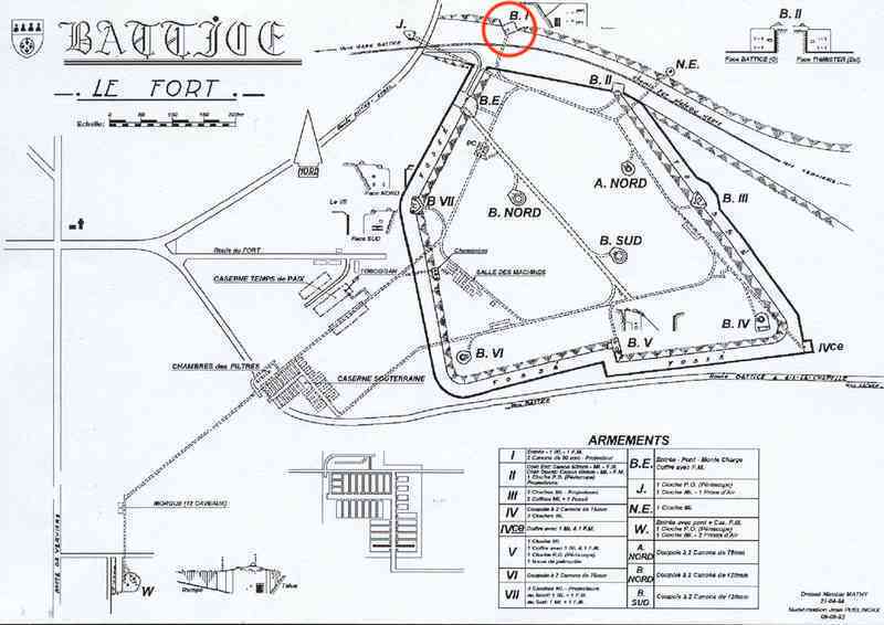 Fortifications belges de la deuxième guerre mondiale, position fortifiée de Liège, première ligne de résistance, fort de Battice. Le bloc I est implanté sur la contrescarpe en bordure de la route N648 reliant Battice à Aubel et le long du fossé abritant la ligne de chemin de fer 38 maintenant disparue mais qui sert encore de promenade aux amateurs de beaux paysages. Le 20 mai 1940 une bombe d'avion pénétra dans le bloc par son débouché d'infanterie en façade. Des bombes de mortier auraient été stockées à cet endroit. L'explosion phénoménale tua tous les hommes du bloc et causa d'importants dégâts toujours visibles. Armement bloc 1, rez-de-chaussée : 1 canon de 60 FRC Mle 1936, 1 fusil-mitrailleur Mle 30 pour la protection de l'issue de patrouille, 1 projecteur CZ33 avec lunette périscopique inversée, 1 goulotte à grenades ; étage : 1 canon de 60 FRC Mle 1936, 1 affût réversible pour 2 mitrailleuses Maxim 08/15. © René Coune 01/2026