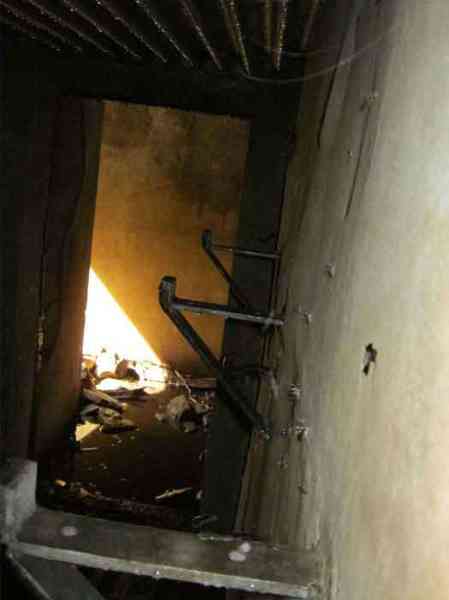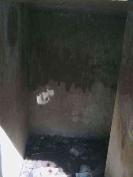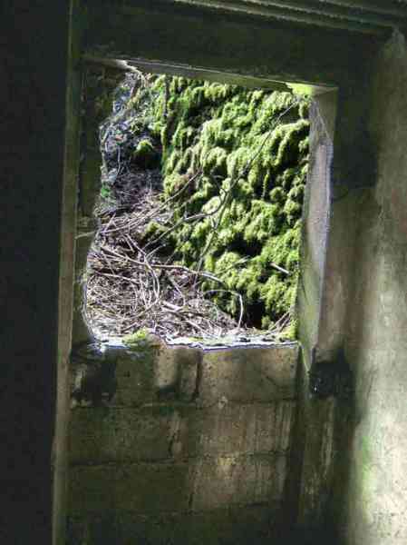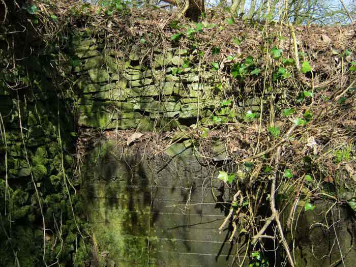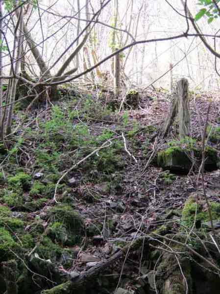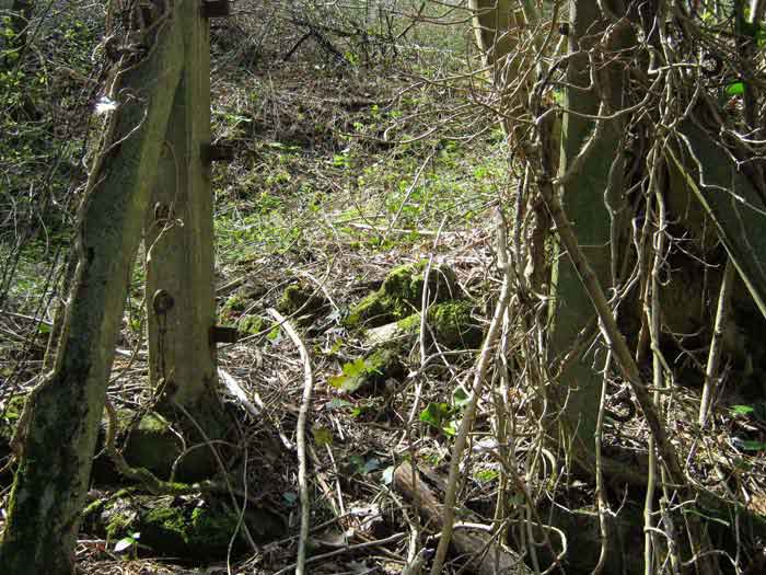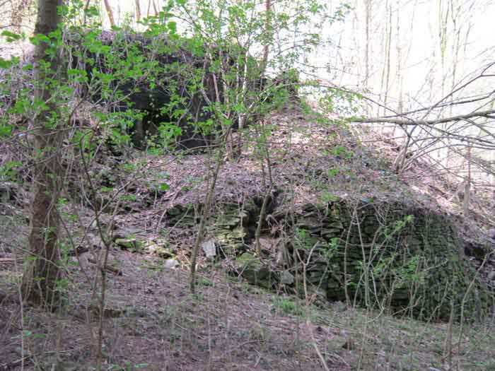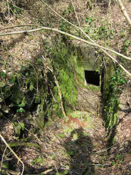 Belgian fortifications from the Second World War, fortified position of Liège, first defensive line, interval Becco-Vesdre, shelter Becco-Vesdre BV-10. BV 10 is located halfway up the hillside at the level of the shelter BV9, with which it crosses its fire. The embrasure is walled up and the stair entrance is open. Present: most of the fence posts, the attachments and hinges of the embrasure closure plate, the hinges of the entrance grille P1, the hinges and the frame of the louvered door P2, the support brackets for the wooden shelves, the attachment for the hook L1 of the Coleman lamp, the hooks L2 for personal equipment, the hooks L3 for rifles, the FRC mount (Royal Cannon Foundry) relatively complete, the tray for the cartridge hopper and its metal support. Missing: the barrier to prevent crossing the fence of the property, the DN markers (National Defence), the entrance grille P1, the closure shutter of the embrasure, certain parts of the FRC mount, the louvered door P2, the closure cover of the grenade launching chute. A low wall of 3 concrete blocks high prevented earth and branches from invading the site, which is clean and structurally in good condition.