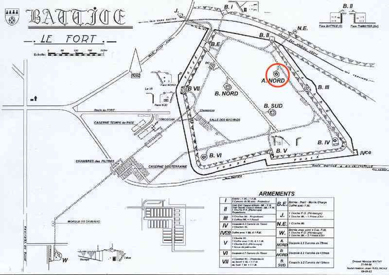 Belgické opevnění z druhé světové války, Opevněná pozice Lutych, první obranná linie, pevnost Battice. Blok "A Sever" je dělostřelecký blok se zatahovací/vysouvací věží pro dva 75 mm kanóny, který byl kompletně zničen všemi známými postupy. Zbývají pouze vnitřní prostory a podzákladí, které budou předmětem budoucí studie. Výzbroj, blok A Sever: 1 zatahovací kopule se 2 spřaženými 75 mm kanóny FRC (Královská slévárna děl) vzor 1934 (120 T > těžký typ > Battice). © René Coune 01/2026