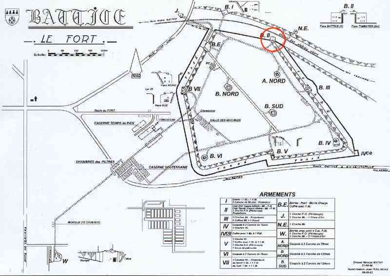 Belgické opevnění z druhé světové války, Opevněná pozice Lutych, první obranná linie, pevnost Battice, eskarpový blok B II. Blok B II, postavený jako kaponiéra, na severoseverovýchod od centrálního masivu, brání příkop bývalé železniční trati 38, nyní přeměněné na RAVeL (Autonomní síť pomalých cest) pro chodce, cyklisty a jezdce milovníky krásných krajin. Výzbroj bloku 2, západní fasáda, přízemí: 1 60 mm kanón FRC vzor 1936; patro: 1 otočná lafeta pro 2 kulomety Maxim 08/15, 1 světlomet CZ 33 s obráceným periskopickým zaměřovačem; východní fasáda; přízemí: 1 60 mm kanón FRC vzor 1936; patro: 1 otočná lafeta pro 2 kulomety Maxim 08/15, 1 světlomet CZ 33 s obráceným periskopickým zaměřovačem; severní fasáda: 1 granátový výmetný žlab; na střeše: 1 dělostřelecká pozorovací kopule s periskopem "SOM" (vzor 36 T > těžký typ > Battice) © René Coune 01/2026