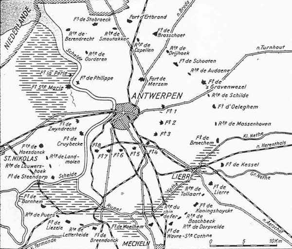 FPA (Fortified Position of Antwerp), outer belt, east-southeast of the city, 1908-1914. 1 cupola 2 x 15 c, 2 cupolas 1 x 12 c, 4 cupolas 1 x 7.5 c, 2 turrets for 1 x 5.7 c and, for flanking, 14 x 5.7 c, 4 x 7.5 c, 4 x 12 c and 2 searchlights 90 c.