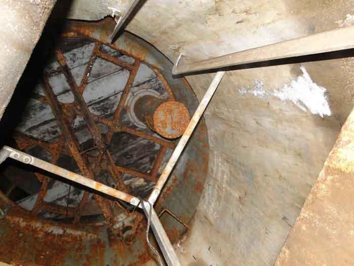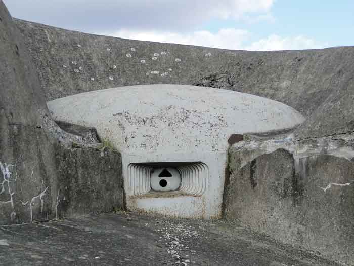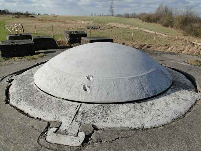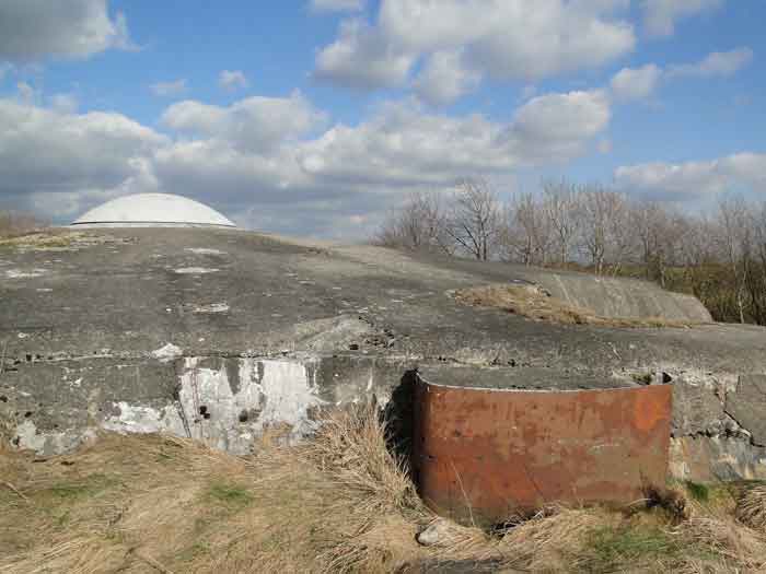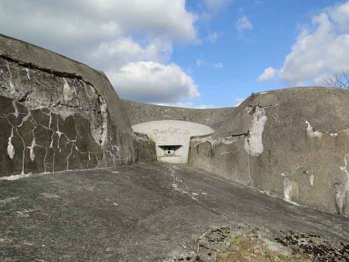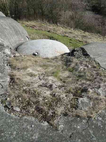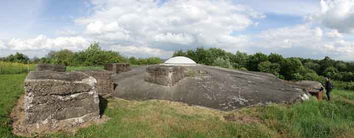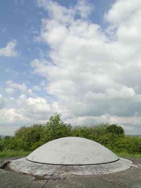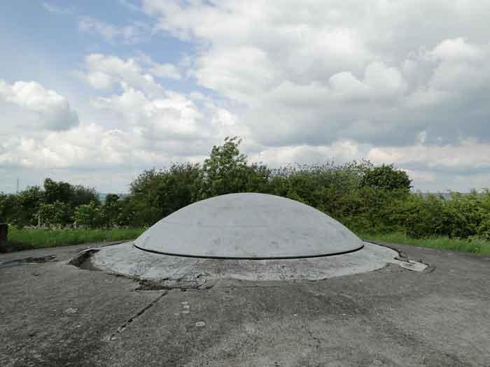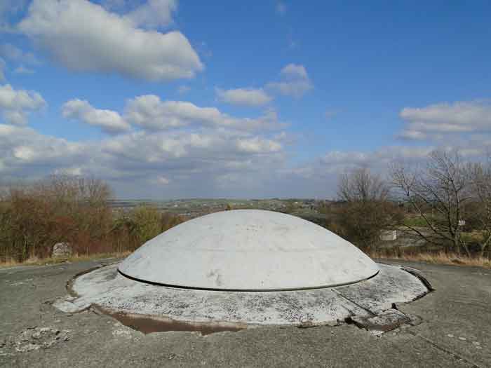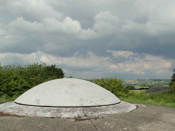 Belgian fortifications of the Second World War, Fortified Position of Liège, first line of resistance, fort of Battice, artillery block B IV. Block IV is located at the southeast corner of the fort, along national road 3 linking Aachen to Liège via Battice and Herve. It is the most forward block, the closest to the German border and the first to be approached when coming from Germany. It is also the only block with a turret to have survived both the firing tests by the Germans during the five years of occupation and the destructive frenzy of scrap dealers after the war. At Battice, everything that can be restored and made functional receives all the attention of the volunteers who watch over the great fort. This turret is no exception. On your next visit, you can see it in operation and admire the precision and elegance of its movements. Armament on the roof: 1 retractable cupola with 2 twin 75 mm guns FRC Model 1934 (120 T > heavy type > Battice), 2 machine gun cloches with 1 mount for 2 Maxim machine guns 08/15 (+/- 54 T > heavy type > Battice), one with an "SOM" periscope and the other with a rocket launcher device. © René Coune 01/2026