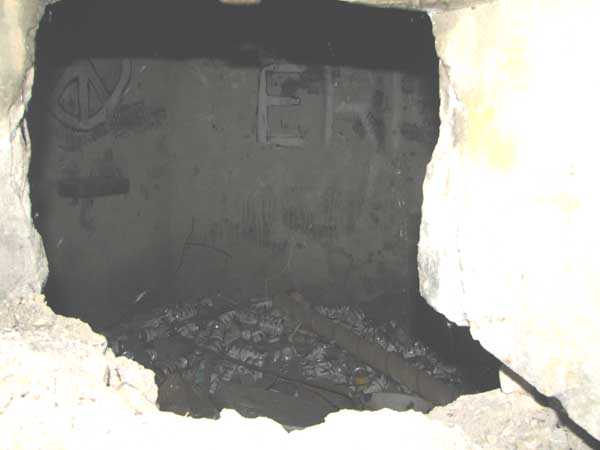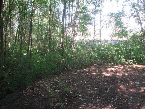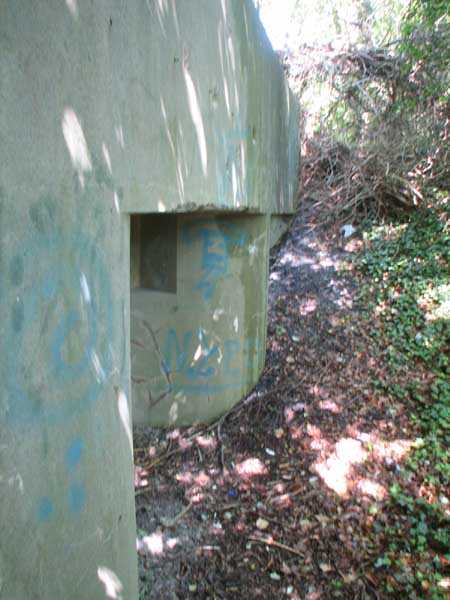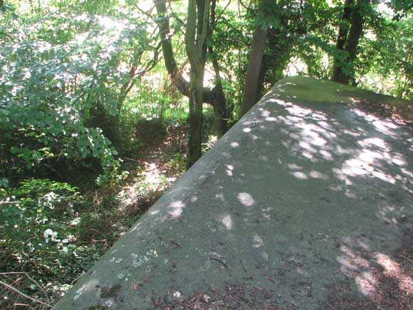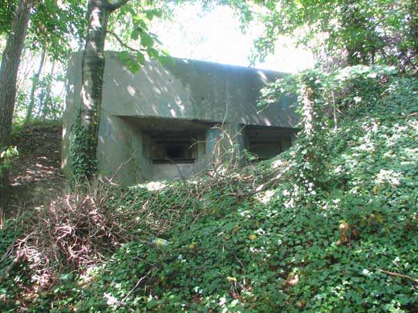 Fortified Position of Liège, second line of resistance, interval shelters. Interval shelter BE 3 is a typical shelter with two machine gun embrasures, one of which is partially blocked by crumbling earth from the embankment, without an observation cupola. It is located in Sart Tilman on Chemin Robiet next to the former powder magazine, adjoining the south side of the football field measuring 105 x 70 m. Outside, there are no longer any DN boundary markers (National Defense) or fence to delimit the military area. The emergency exit was passable in July 2007. I did not visit the interior. Exterior condition acceptable.