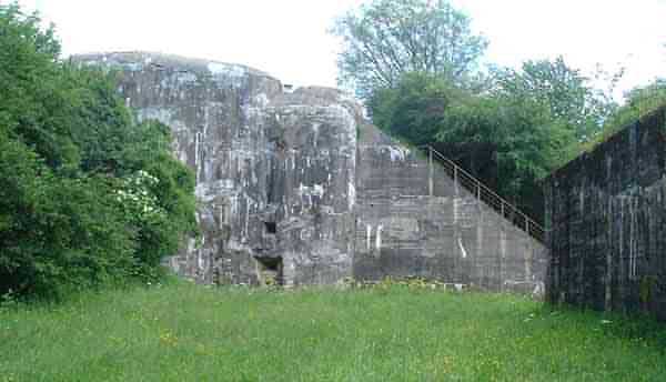Belgian fortifications of the Second World War, Fortified Position of Liège, first line of resistance, fort of Battice. Block V has the triple mission of defending the western part of the southern ditch, observing the surroundings from its elevated position, and securing the infantry exit. During the Röchling trials in the winter of 1941, it was pierced from the roof through several levels. Armament block 5, ground floor: 1 reversible mount for 2 Maxim machine guns 08/15, 1 automatic rifle Mle 30 (protection of the patrol exit); 1st floor: 1 searchlight "CZ 33", 1 grenade-launching chute; 2nd floor: access to the machine gun cloche and the "SOM" cloche; 3rd floor: 1 machine gun cloche with 1 mount for 2 Maxim machine guns 08/15 (+/- 54 T > heavy type > Battice) with a rocket launcher device; roof: 1 artillery observation cloche with "SOM" periscope (36 T > heavy type > Battice). © René Coune 01/2026