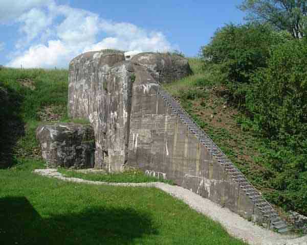 Belgické opevnění z druhé světové války, Opevněná pozice Lutych, první obranná linie, pevnost Battice. Blok V má trojí úkol: bránit západní část jižního příkopu, pozorovat okolí ze své vyvýšené polohy a zajišťovat pěchotní východ. Při zkouškách Röchling v zimě 1941 byl proražen od střechy přes několik podlaží. Výzbroj bloku 5, přízemí: 1 otočná lafeta pro 2 kulomety Maxim 08/15, 1 automatická puška vzor 30 (ochrana výstupu hlídek); 1. patro: 1 světlomet "CZ 33", 1 granátový výmetný žlab; 2. patro: přístup ke kulometné kopuli a kopuli "SOM"; 3. patro: 1 kulometná kopule s 1 lafetou pro 2 kulomety Maxim 08/15 (+/- 54 T > těžký typ > Battice) s raketometem; střecha: 1 dělostřelecká pozorovací kopule s periskopem "SOM" (36 T > těžký typ > Battice). © René Coune 01/2026