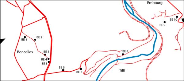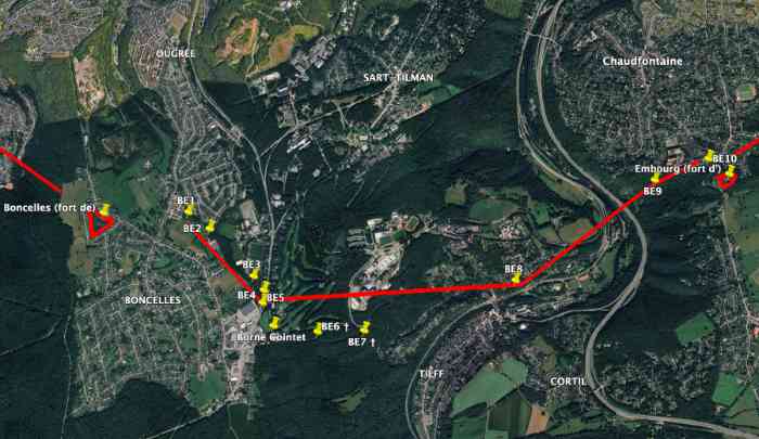 L'intervalle PFL2 Boncelles-Embourg comptait 10 fortins tels qu'illustrés sur la carte ci-dessous. À ce jour, avec vous, nous en avons retrouvé et photographié 8 qui sont tous vidés de leur contenu et dont l'entrée est généralement murée. BE6 et BE7 sont détruits. Régulièrement, les murets qui condamnent les entrée sont démolis par des touristes de passage et les abris sont visité. Parfois, ils sont abîmes ou tagués et c'est bien dommage. Dans l'ensemble leur stucture n'a pas trop soufert sauf pour ceux dont les cloches d'observation ont été arrachées.