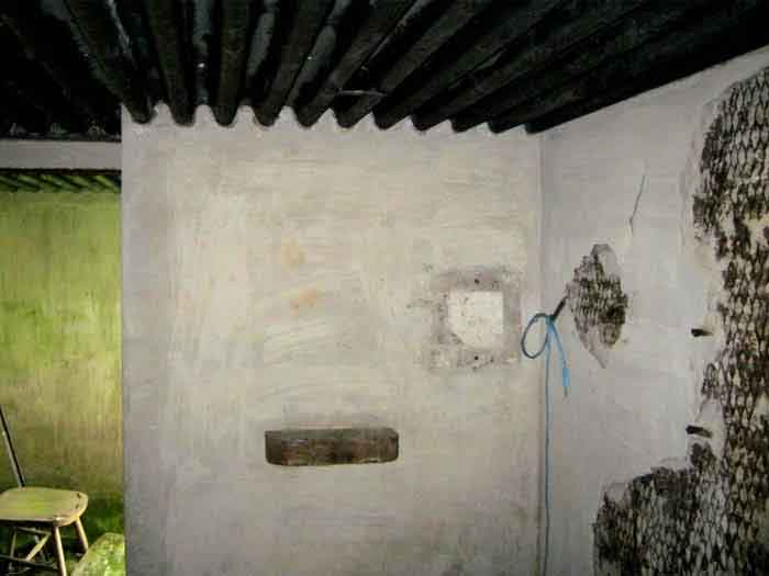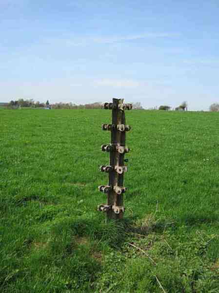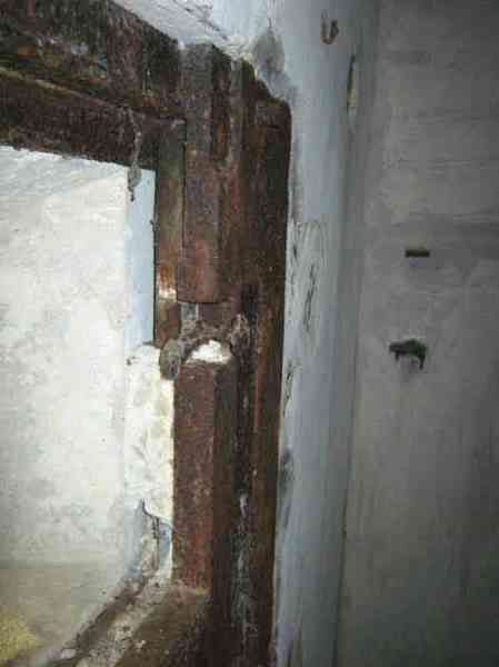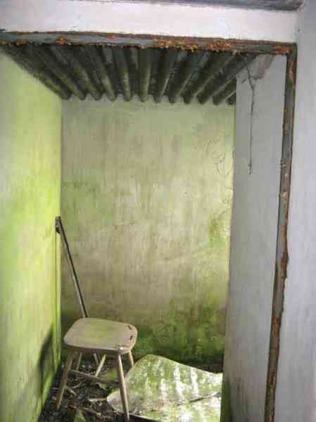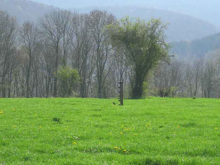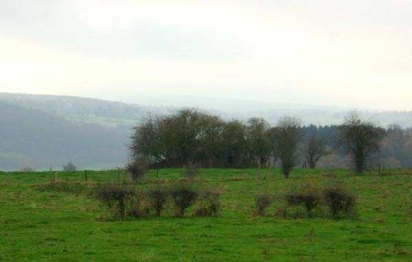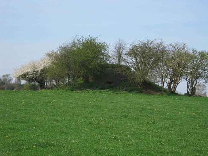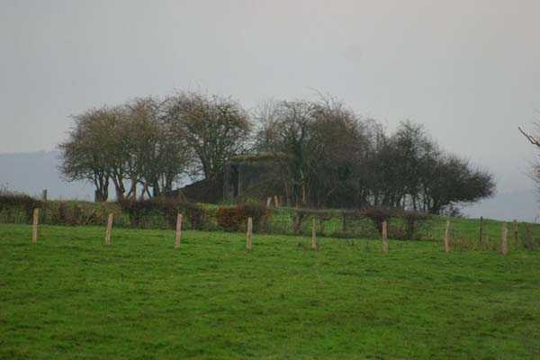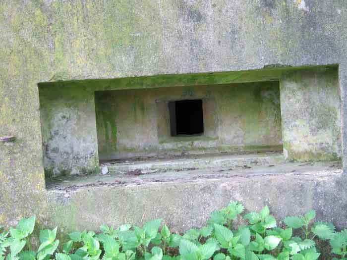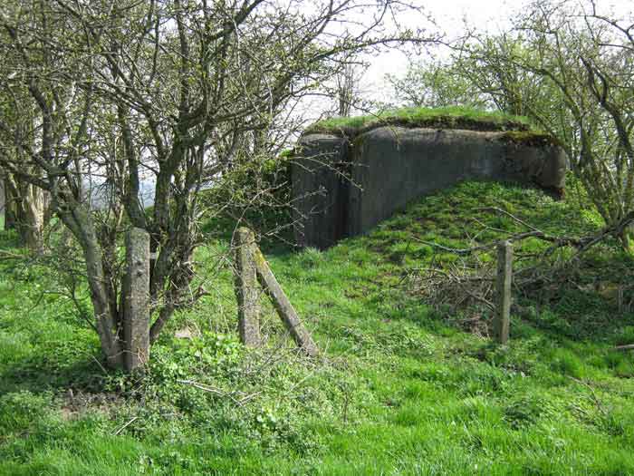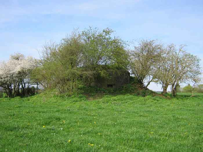 Belgian fortifications from the Second World War, fortified position of Liège, first defensive line, shelter Becco-Vesdre BV-6. It is located in a meadow southeast of Jevoumont. It covers BV 7. It is partially surrounded by its living hedge and the concrete posts of its fence. The embrasure and entrance are open. The exterior and interior, somewhat cluttered, are in good condition. Present: part of the FRC mount, the attachments of the embrasure shutter, the brackets for the shelves, the door hinges and the door frame of door P2, the service hooks L2, the tray for the cartridge hopper, the ceiling attachment for the hook of the Coleman lamp. Missing: the DN markers (National Defence), part of the FRC mount, the embrasure shutter, flap of the grenade launching chute, the service hooks L3, grille P1, louvered door P2, hook for lighting. Almost clean and structurally in good condition.