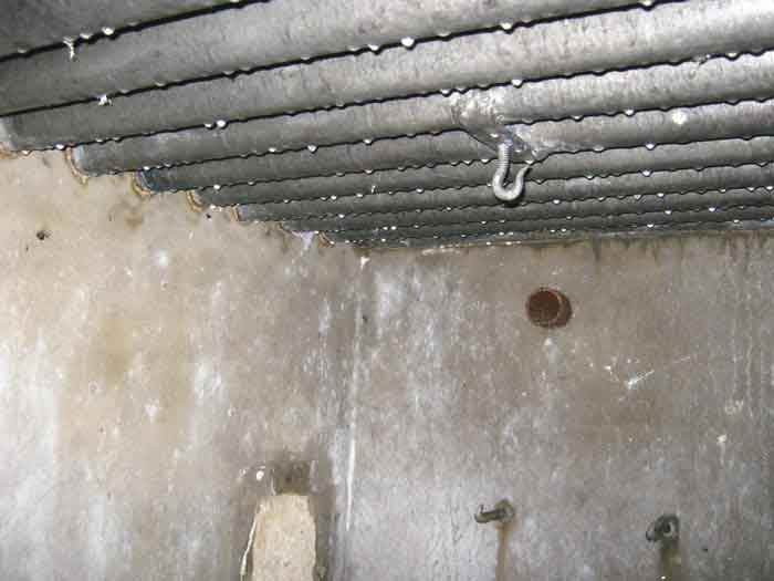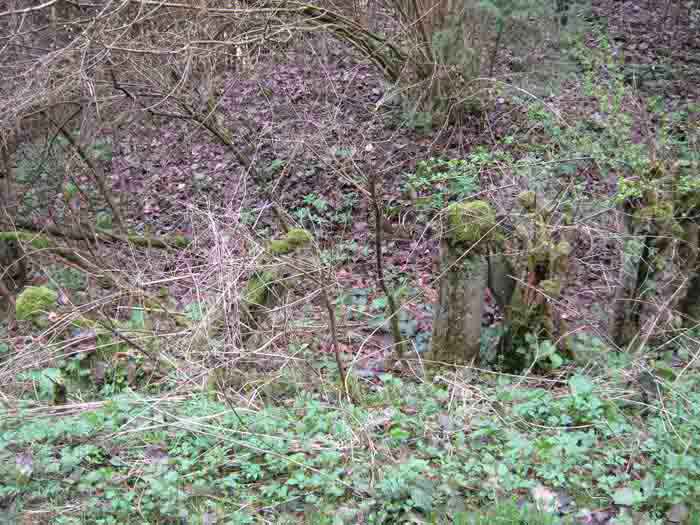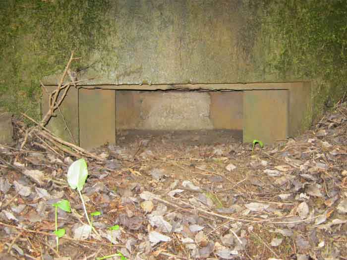 Belgian fortifications from the Second World War, fortified position of Liège, first defensive line, shelter Becco-Vesdre BV-4 of the interval type. BV 4 is located in the small valley of the Targnon, which it covers with its fire, and in a fir forest. It is surrounded by its fence of concrete posts. The embrasure is walled up, the entrance is open. Present: the Chardôme support for the sled mount, the brackets for the shelves, the service hooks L3, the door hinges and the door frame of door P2, the tray for the cartridge hopper, the ceiling attachment for the hook of the oil lamp and the hook. Missing: flap of the grenade launching chute, grille P1, louvered door P2.