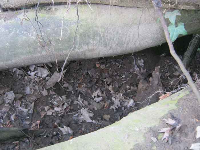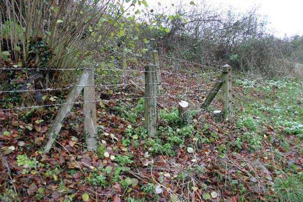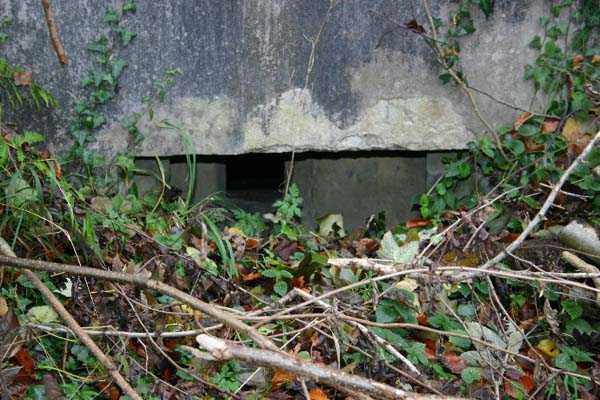 Belgian fortifications from the Second World War, fortified position of Liège, first defensive line, interval Becco-Vesdre, shelter Becco-Vesdre BV-15. BV 15 is separated from the Höegne by a meadow. It is backed against a small mound at the level of the football fields of Juslenville. It crosses its fire with BV 16, which is a few tens of meters away. It still has the concrete posts of its fence, the barbed wire has been replaced. The embrasure is closed and its shutter is missing but the hinges and attachments are present. Given the arrangement of the ventilation ducts, it can be deduced that it is an FRC mount. The entrance has unfortunately been blocked by the fall of a tree overhanging the structure.