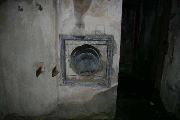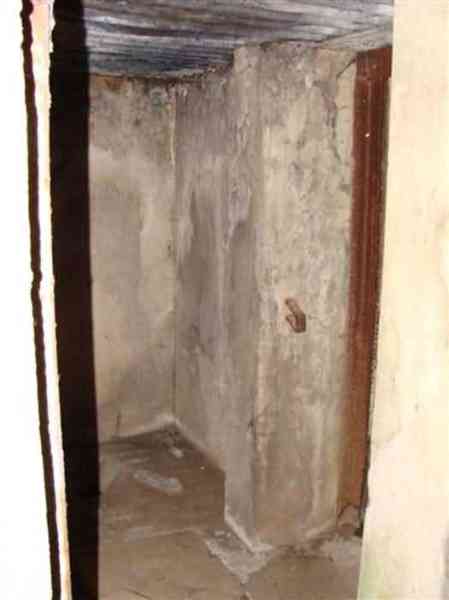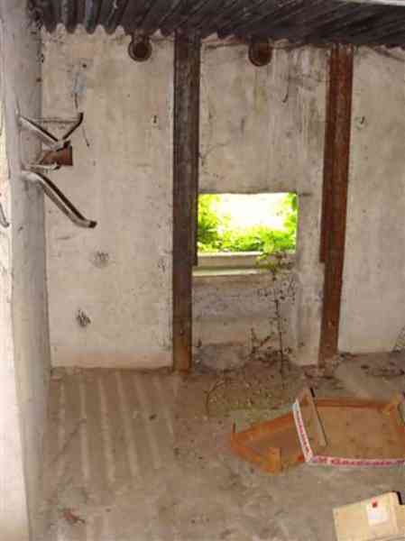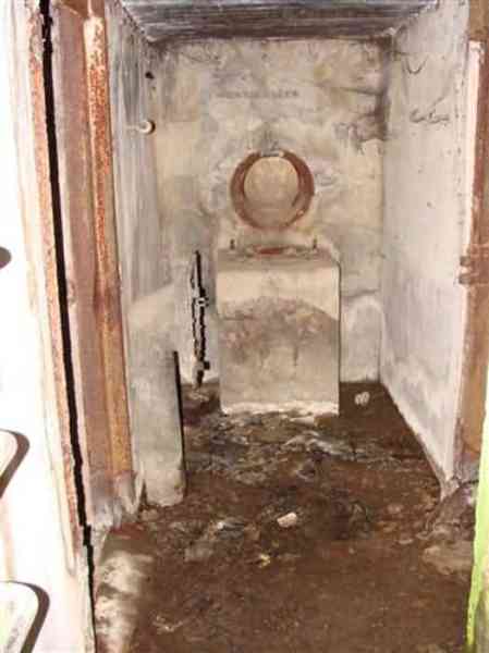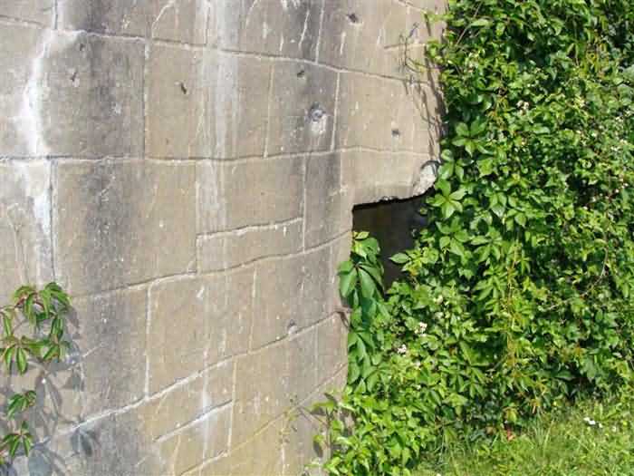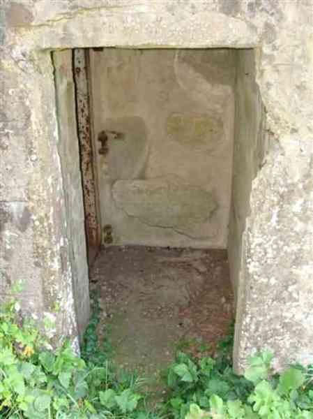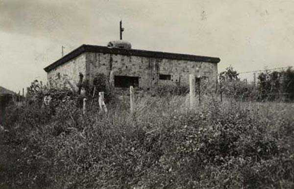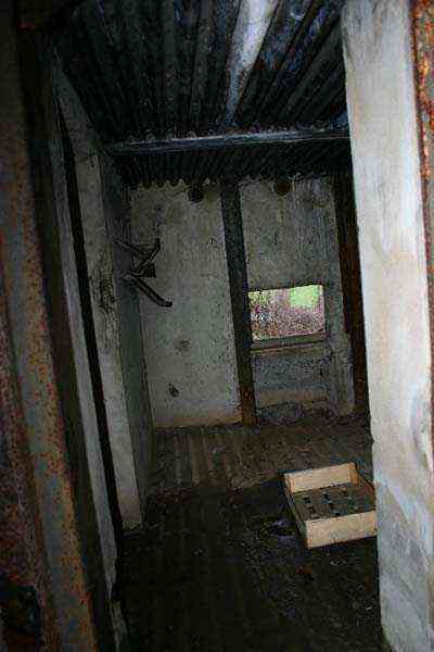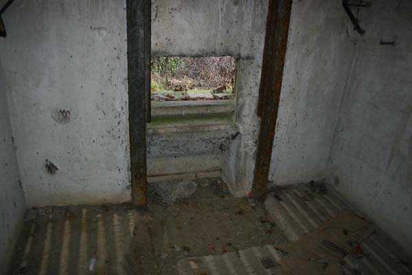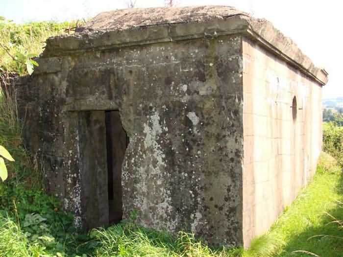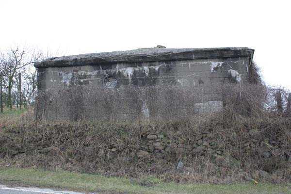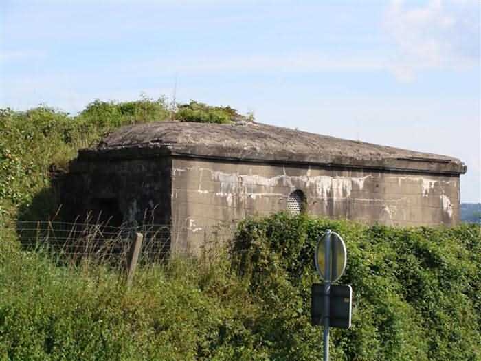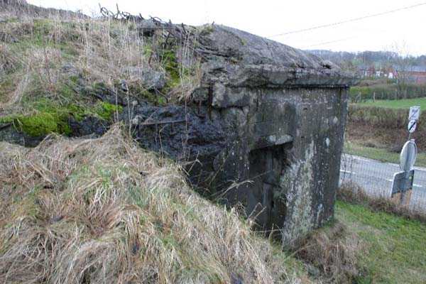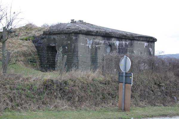 Belgian fortifications from the Second World War, fortified position of Liège, first defensive line, interval Becco-Vesdre, shelter Becco-Vesdre BV-14. BV 14 is the southern observation post of Fort Tancrémont. It is located on the right of the national road N62, Tillot street, when leaving Theux towards Louveigné, at the hamlet of Mont from which it took its name. Still surrounded by its fence posts and the access barrier, it is a shelter comprising six rooms and a defended entrance airlock. It has an embrasure for a 47 mm anti-tank gun, an embrasure for a Maxim machine gun, and an embrasure for a 30 cm searchlight. There are two grenade launching chutes to defend the two unarmed sides, a rest room, a room for a "squat toilet". It also possessed an observation cupola, of which only the access shaft and the rungs to climb up remain. Some service inscriptions, hooks L2 and L3, support brackets for the shelves, various ventilation ducts, a voice pipe to communicate between the observation cupola and the lower room.