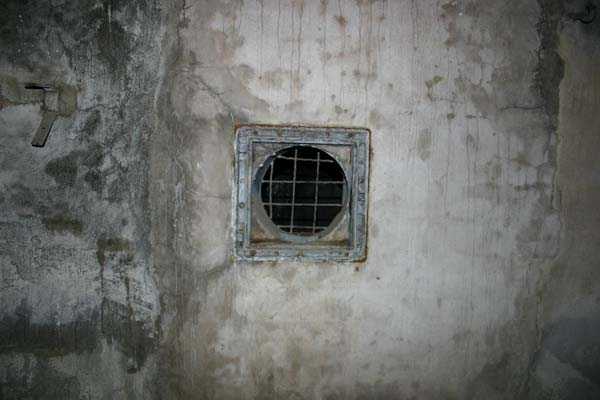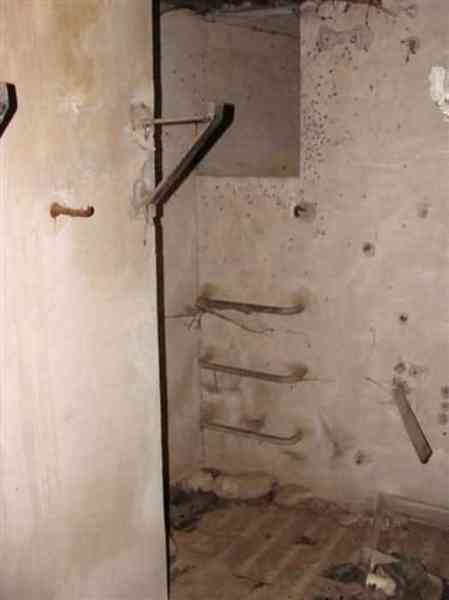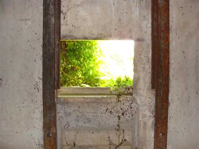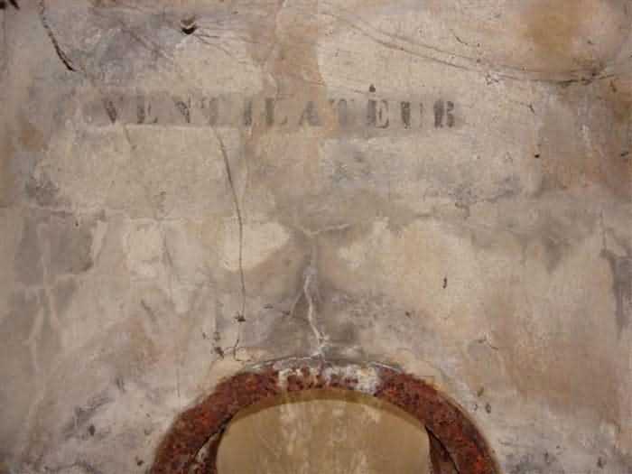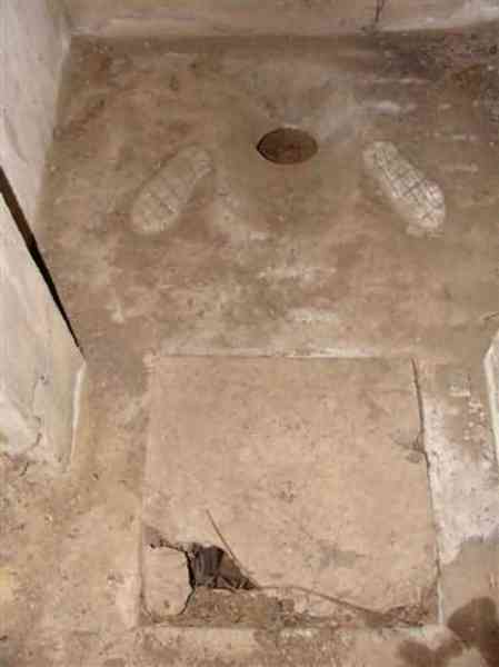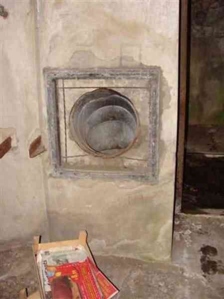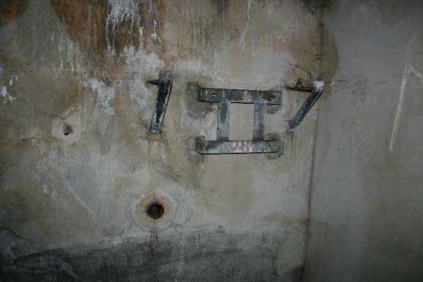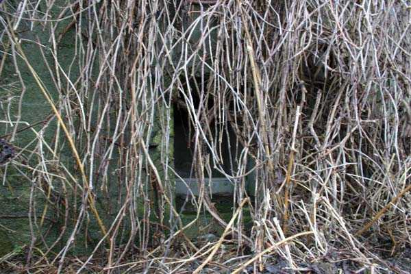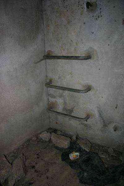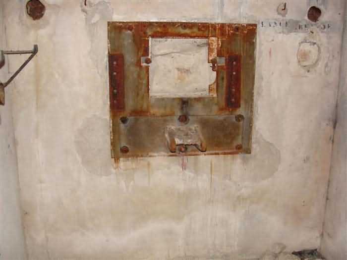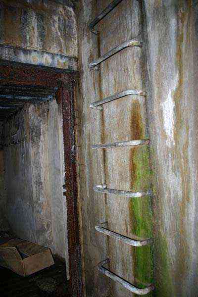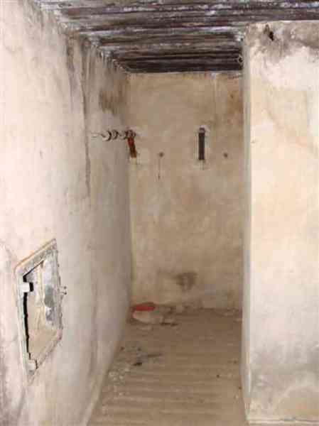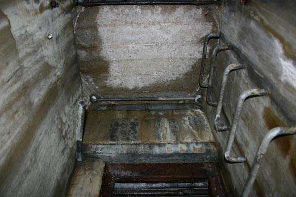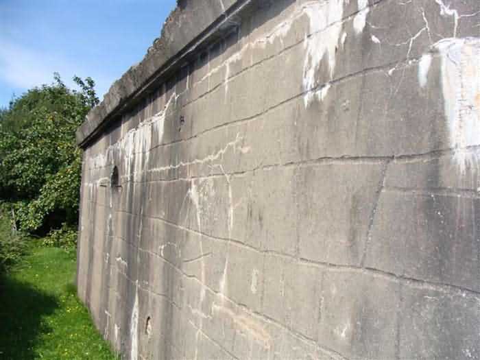 Belgian fortifications from the Second World War, fortified position of Liège, first defensive line, interval Becco-Vesdre, shelter Becco-Vesdre BV-14. BV 14 is the southern observation post of Fort Tancrémont. It is located on the right of the national road N62, Tillot street, when leaving Theux towards Louveigné, at the hamlet of Mont from which it took its name. Still surrounded by its fence posts and the access barrier, it is a shelter comprising six rooms and a defended entrance airlock. It has an embrasure for a 47 mm anti-tank gun, an embrasure for a Maxim machine gun, and an embrasure for a 30 cm searchlight. There are two grenade launching chutes to defend the two unarmed sides, a rest room, a room for a "squat toilet". It also possessed an observation cupola, of which only the access shaft and the rungs to climb up remain. Some service inscriptions, hooks L2 and L3, support brackets for the shelves, various ventilation ducts, a voice pipe to communicate between the observation cupola and the lower room.