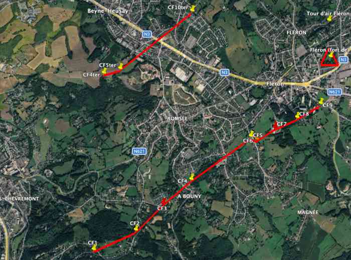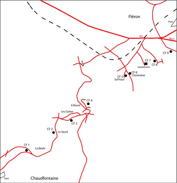 Befestigte Stellung Lüttich, zweite Widerstandslinie. Das Intervall VSL2 Chaudfontaine-Fléron umfasst 12 Unterstände auf zwei Verteidigungslinien. Die erste Linie zwischen Chaudfontaine und Fléron ist mit 9 Unterständen nummeriert CF1 bis CF9 versehen, von denen CF3 und CF7 zerstört sind und CF6 sich in schlechtem Zustand befindet. Die zweite Linie befindet sich 1 600 m weiter hinten, westlich, zwischen Romsée und Beyne-Heusay und umfasst 3 Unterstände nummeriert CF4ter, CF5ter und CF10ter. Sie befinden sich auf der Verteidigungslinie der Gegenstoßunterstände.