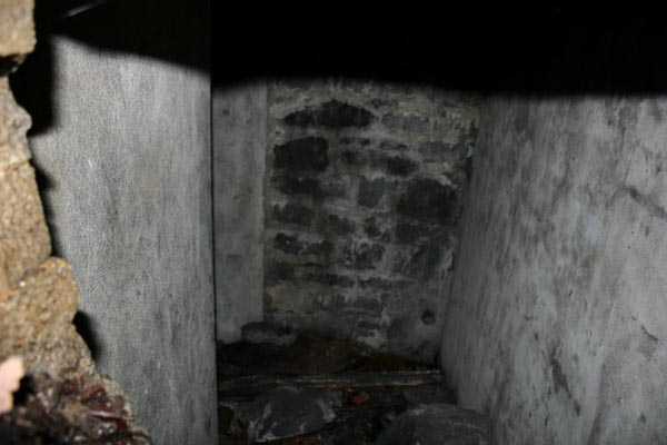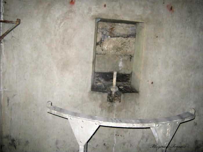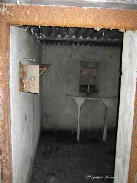 Belgian fortifications of the Second World War, first line of defenses of Liège, FPL1, Comblain-Sougné interval, shelter CS2. Shelter with an embrasure for a Maxim machine gun in relatively good condition. The mount for the Chardôme carriage is still in place and the axle still has its bolt. The metal consoles for the shelves and their service hooks are still present. The mounting plate for the cartridge hopper and the lamp hooks are still in place. The grenade-launching chute still has its closing flap. The almost completely walled-up entrance leaves only a small, quite difficult passage and one should not be afraid of getting dirty, but the interior is relatively clean.