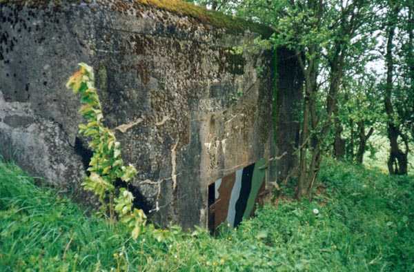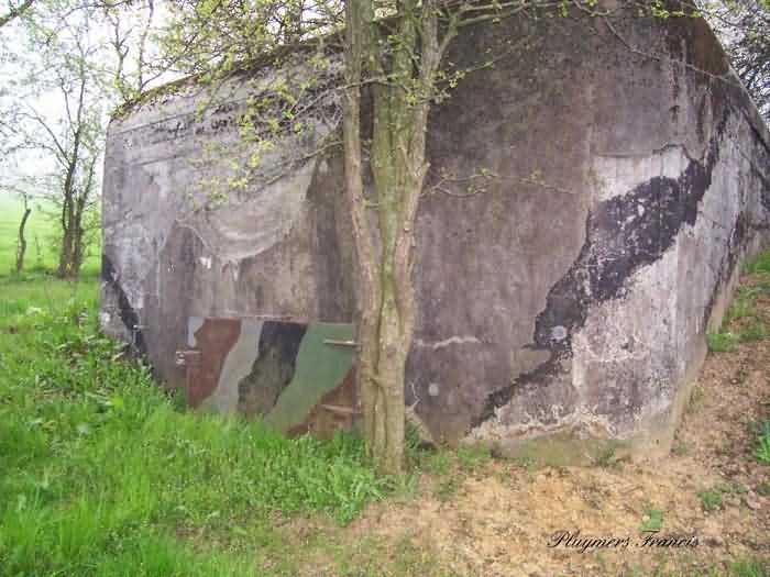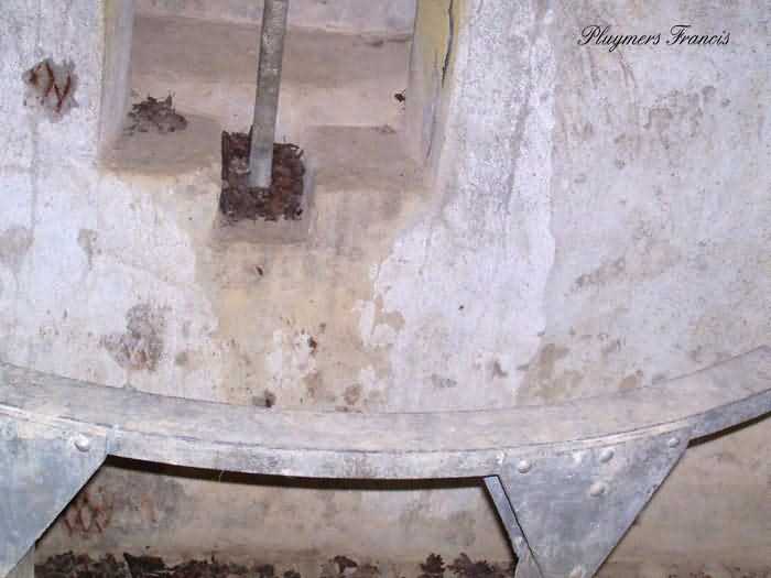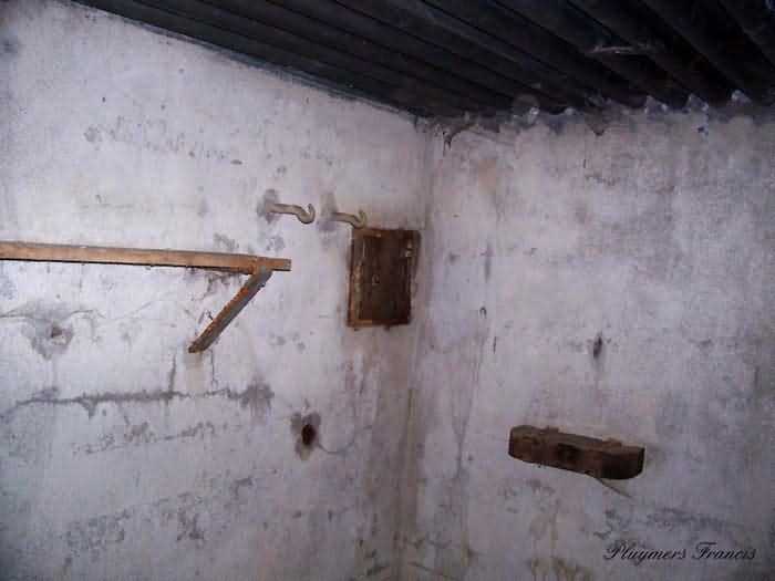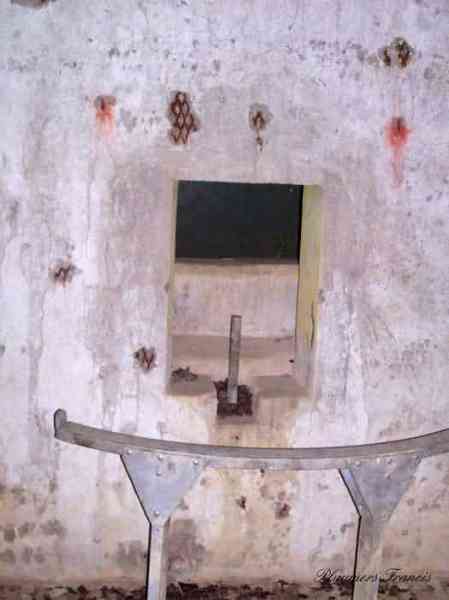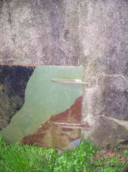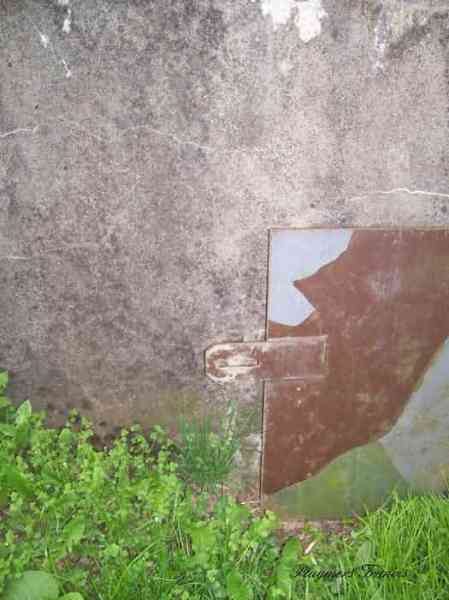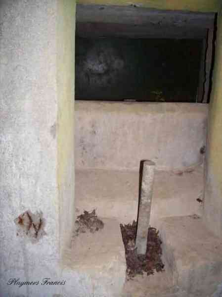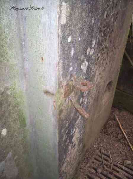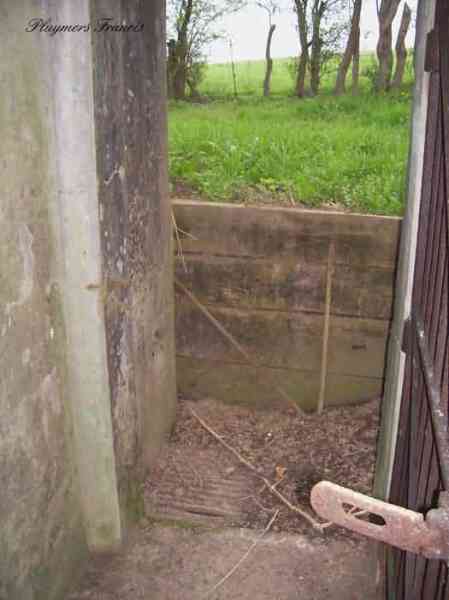 Belgian fortifications of the Second World War, first line of defenses of Liège, FPL1, Comblain-Sougné interval, shelter CS6. Shelter for a Maxim machine gun on a Chardôme mount, located in the same farm track Rue Pierreuxchamps, 170 m east of CS5 and 270 m west of CS7. The mount for the Chardôme carriage is still in place although the axle has lost its bolt. The metal consoles with their service hooks are still present. The mounting plate for the cartridge hopper is in place. The grenade-launching chute still has its closing flap. The entrance grill, the louvered door, the embrasure shutter have not moved. Good general condition.