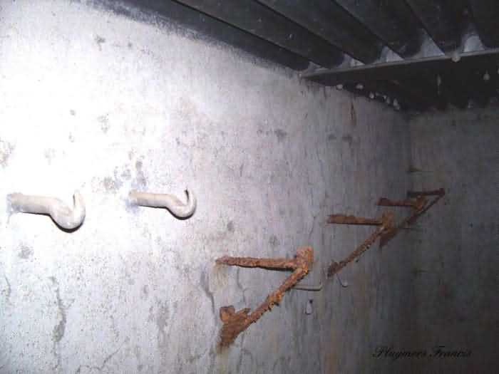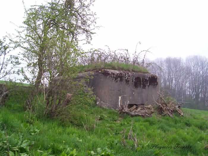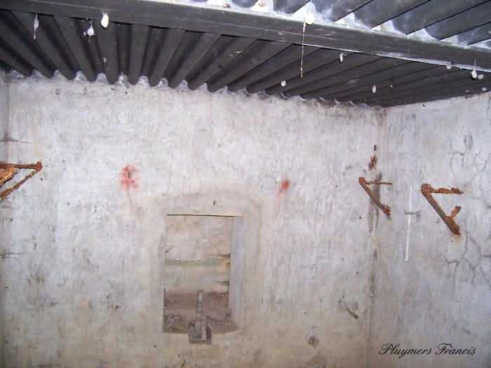 Belgian fortifications of the Second World War, first line of defenses of Liège, FPL1, Comblain-Sougné interval, shelter CS7. Shelter with an embrasure for a Maxim machine gun, structurally in good condition but particularly dirty inside. Located at the eastern end of the farm track on Rue Pierreuxchamps, 270 m east of shelter CS6. The mount for the Chardôme carriage is still in place although the axle has lost its bolt. The metal consoles with their service hooks are still present. The mounting plate for the cartridge hopper is in place. The grenade-launching chute still has its closing flap. The entrance grill and the louvered door have not moved.