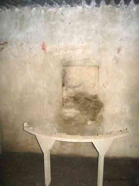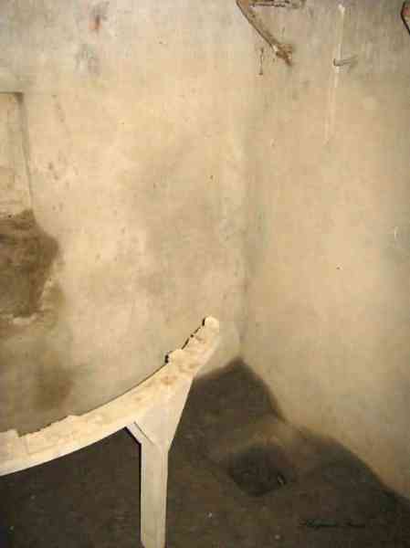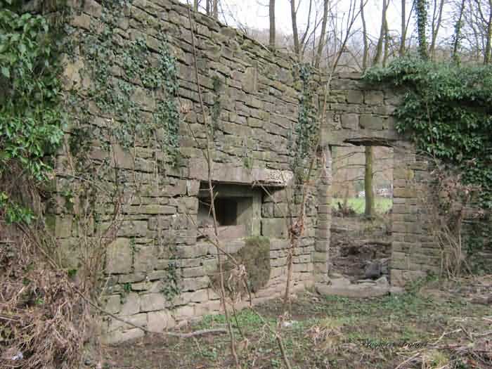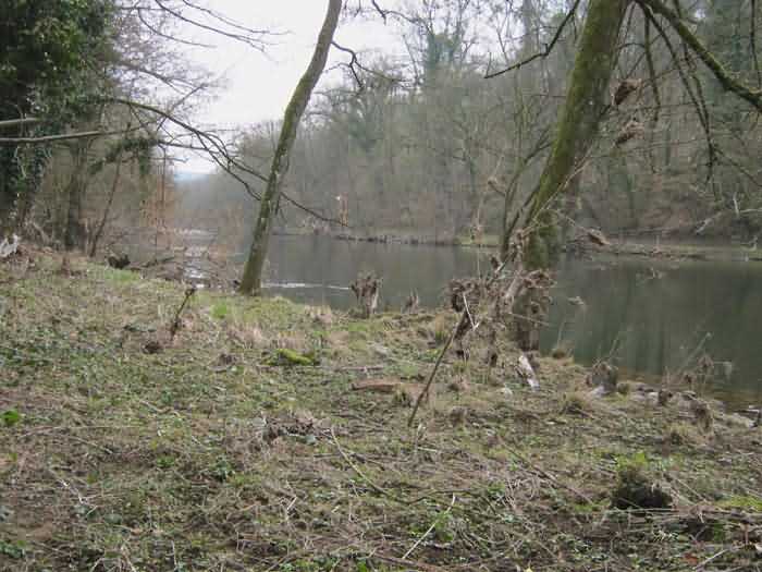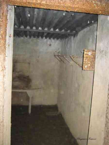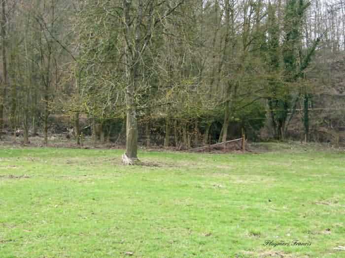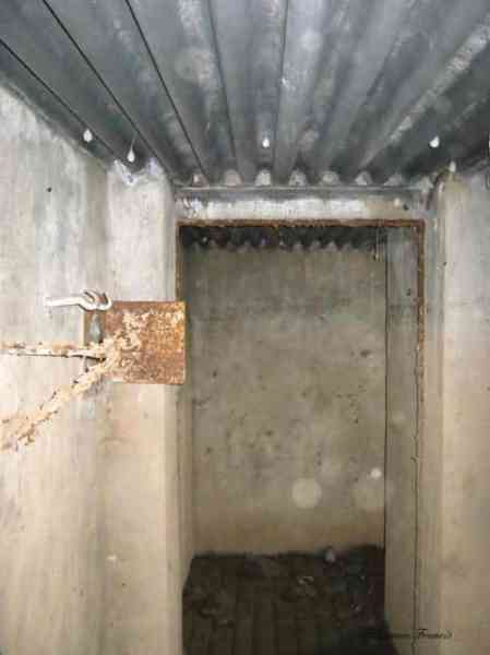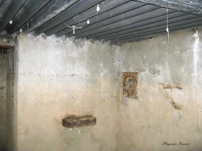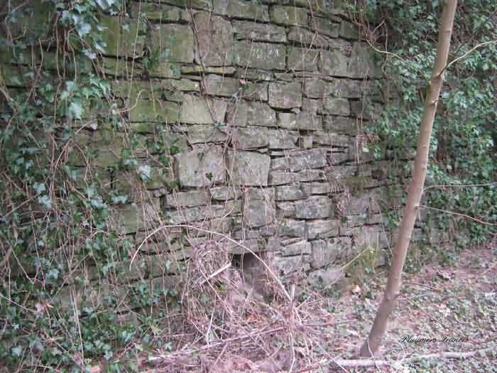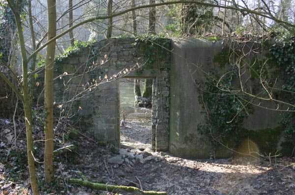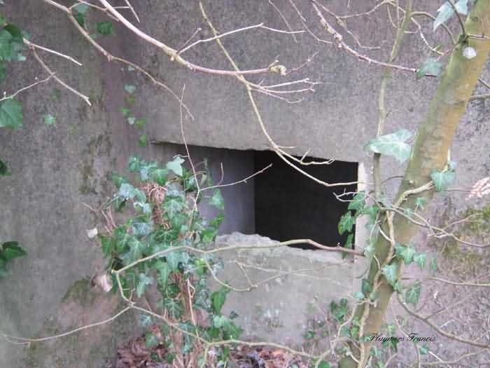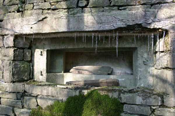 Belgian fortifications of the Second World War, Fortified Position of Liège, Comblain-Sougné interval of the first line, shelter CS11. Directly on the right bank of the Amblève, sometimes poetically spelled Emblève, excellent external condition, the stone camouflage is in impeccable condition. Good interior condition, trace of flooding. Chardôme support for sleigh mount of the Maxim machine gun. Shelf brackets and service hooks still present. Mounting plate for the cartridge hopper is still in place. Hook for the lamp complete. One grenade-launching chute covering the entrance. The other, still fitted with its closing flap, covering the opposite side. Presence of a DN boundary stone delimiting the military terrain. Private property, the land belongs to the lady of the castle.