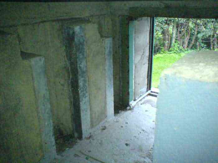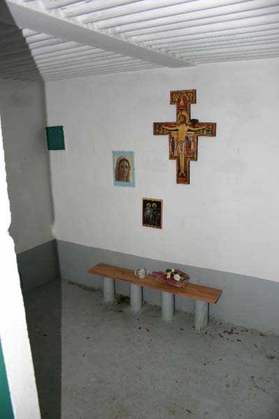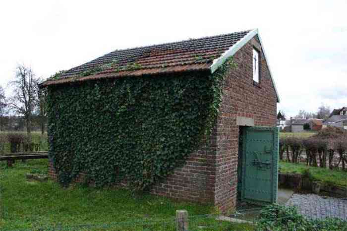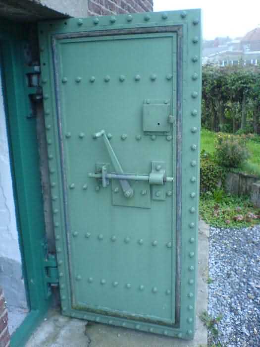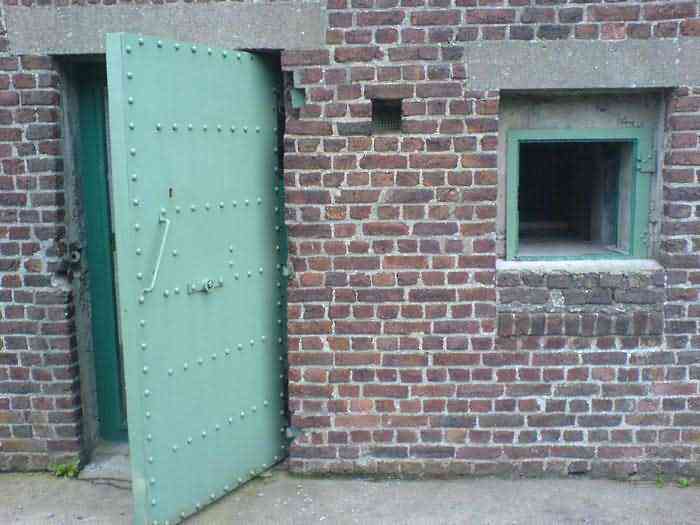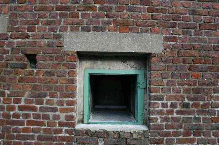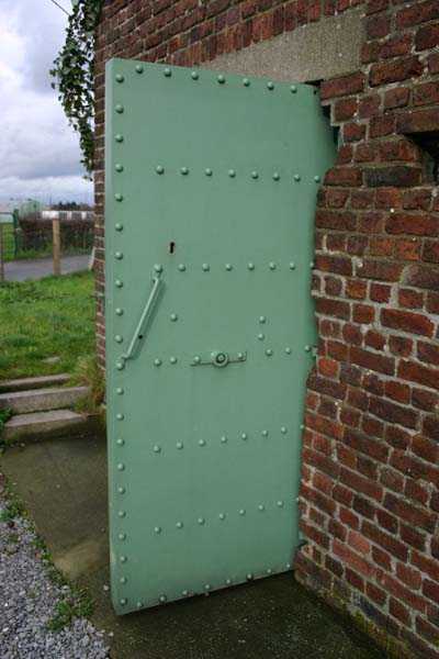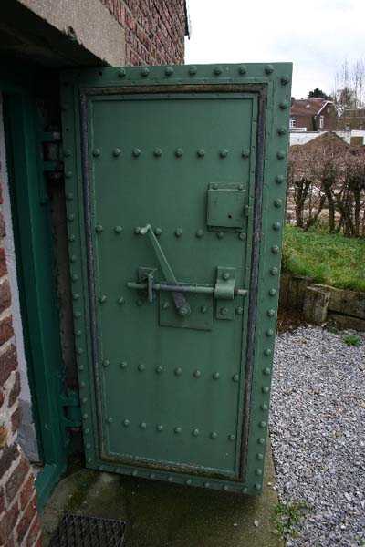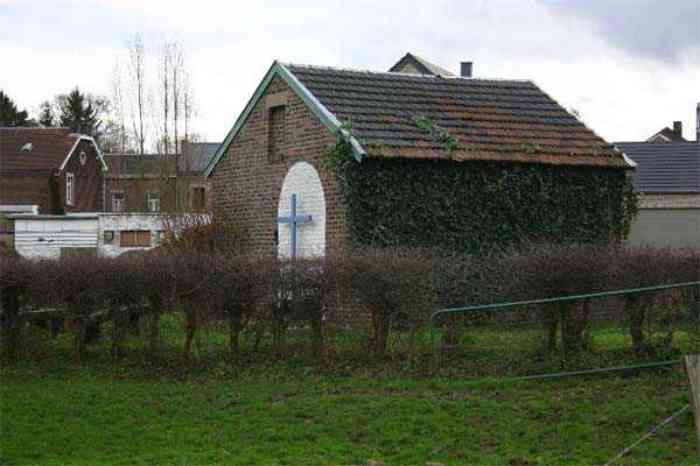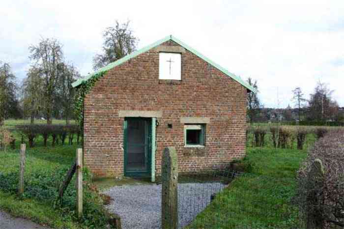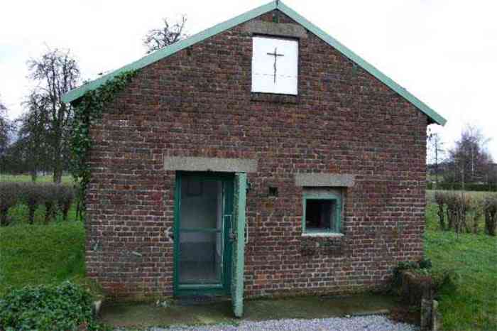 Telephone exchange CTF 13 Barchon, 177 m/asl, is located at 1 Rue del Potale, 580 m east-southeast of salient 3 of the fort of Barchon. It is a typical construction clad in local brick with a gable roof, representing a small agricultural annex topped with a pseudo hayloft. Perfectly maintained, it still has its armored door and is currently arranged as a chapel. The three cable outlet tubes of 8 cm diameter spaced 30 cm apart are at ground level with their closing flaps. The small firing window for a light weapon, next to the grenade launcher chute with its closing flap, has received a stained glass window depicting a stylized, very colorful angel. On the ceiling remains the attachment for the Coleman lamp hook. The left side wall shows four L2 hooks and an emergency exit in a high position lacking its closure beams. A few boundary posts of the military area remain.