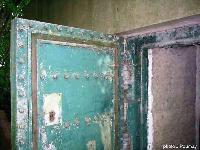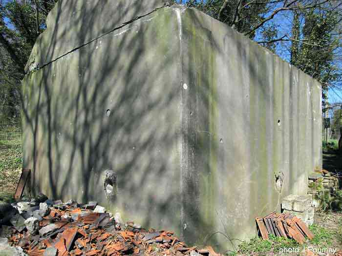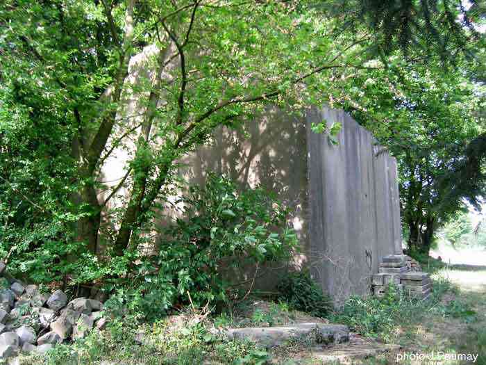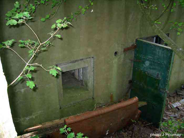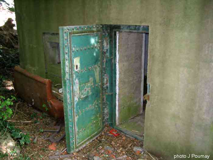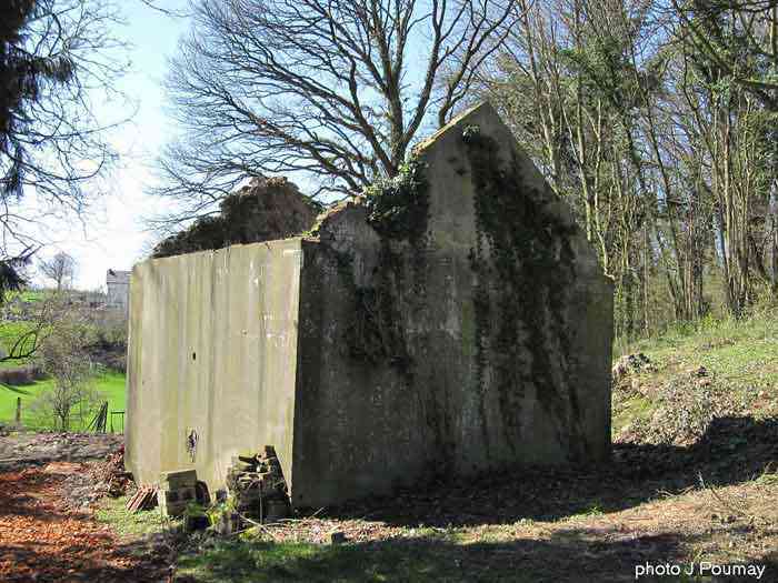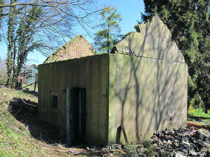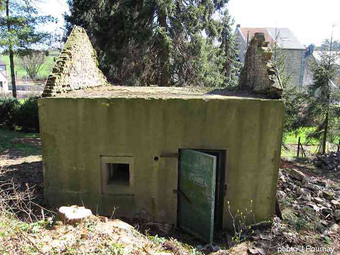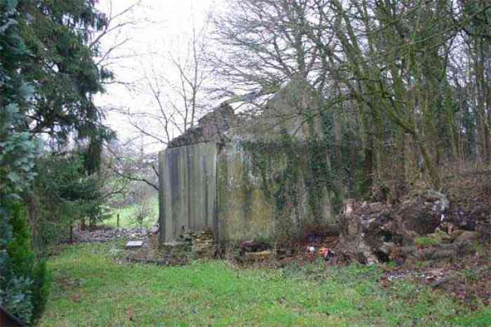 Telephone exchange CTF 15 Blindhef, 231 m/asl, is located at 68 Rue de la China in Sprimont. It is a typical construction with a gable roof of local tiles and exterior wall cladding of smooth cement, clearly visible around its emergency exit placed in a high position in case the outward-opening door should be blocked by rubble. In 2008 it had lost its roof and only its ridge beam remained. In 2011 it still had its armored door and remains of cable coming from outside, as well as its DN2 cadastral marker (National Defense) and its displaced DN1 cadastral marker. Considered disappeared, we photographed it in the spring of 2026. The ridge beam had disappeared, as had the triangular gables that supported it, transforming it into a flat-roof CTF. It is now on private property, and access is therefore subject to authorization.