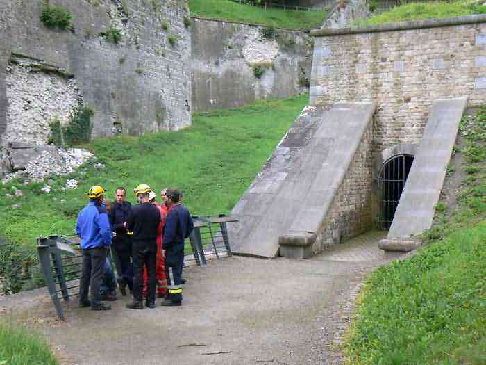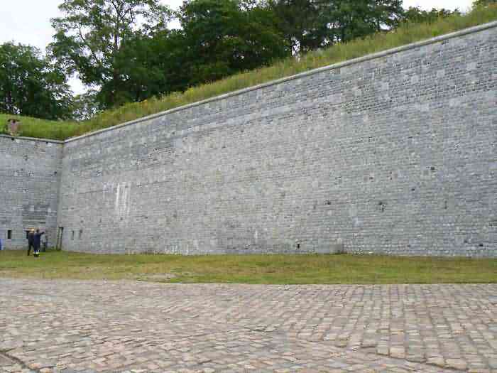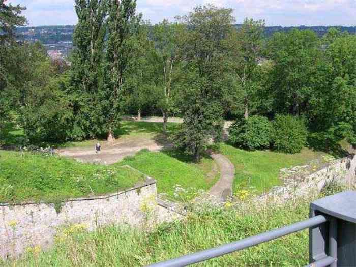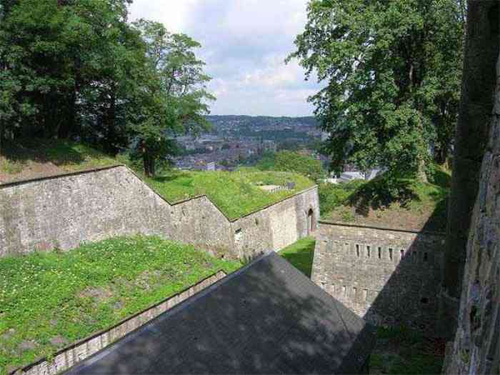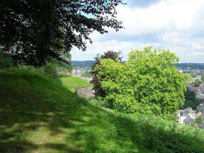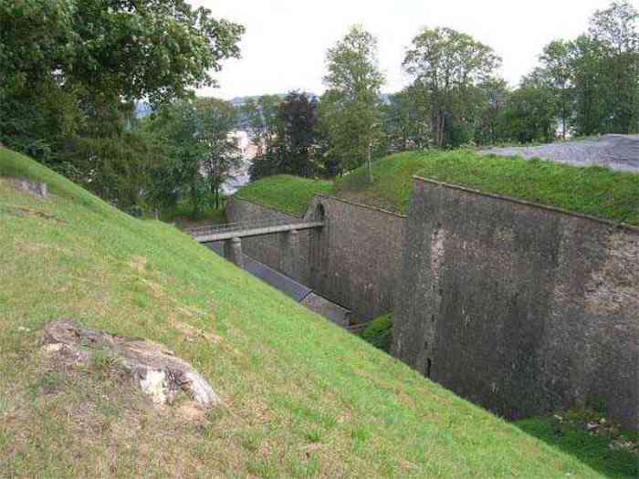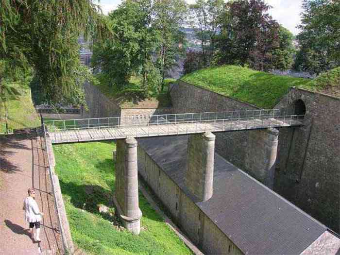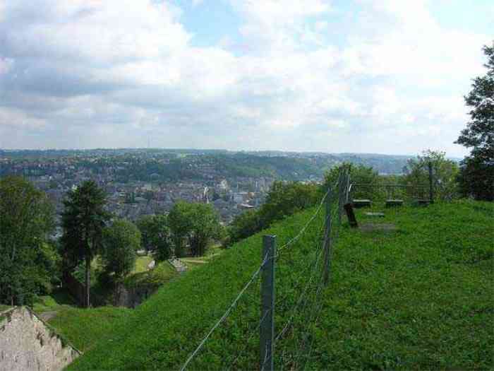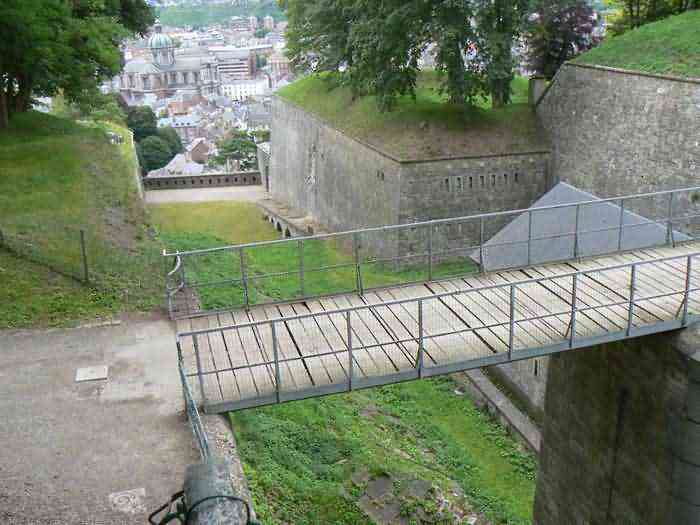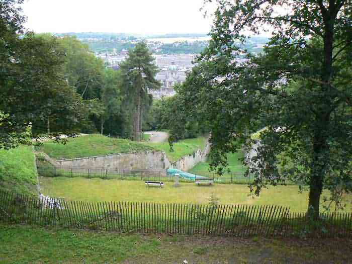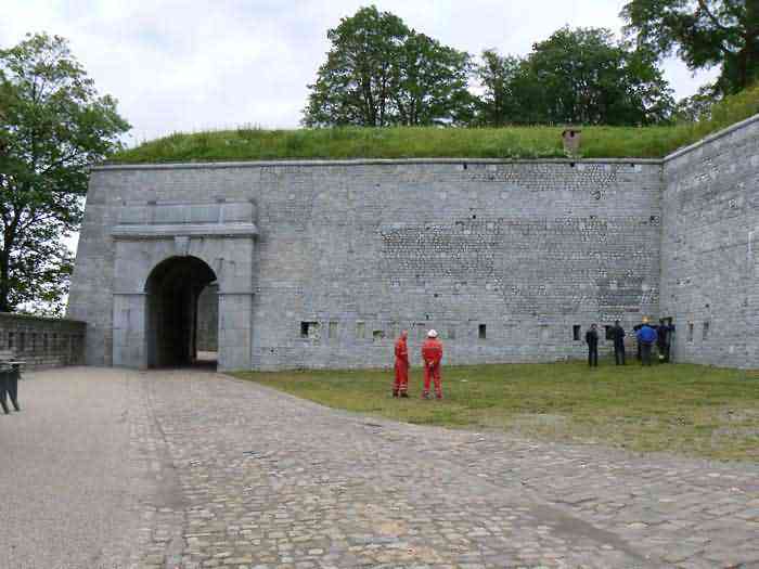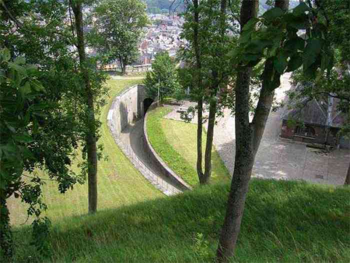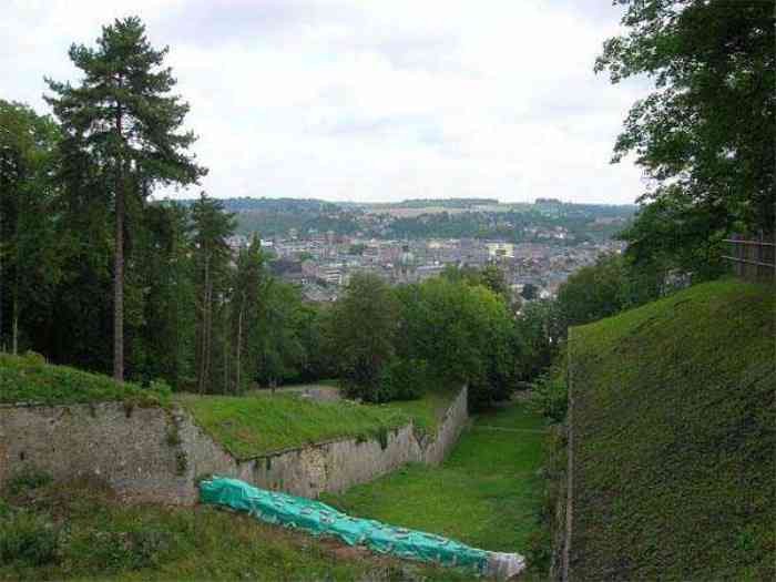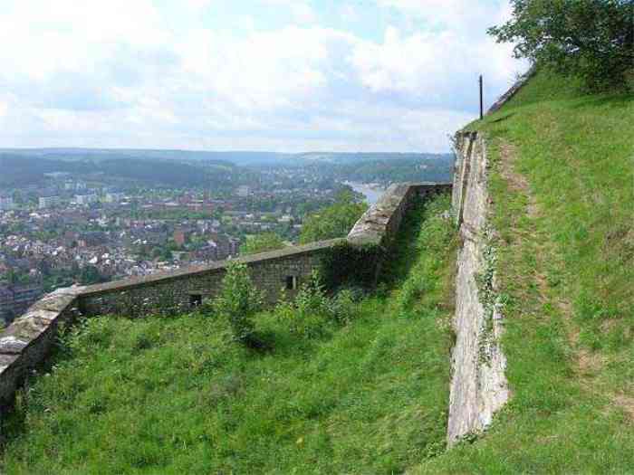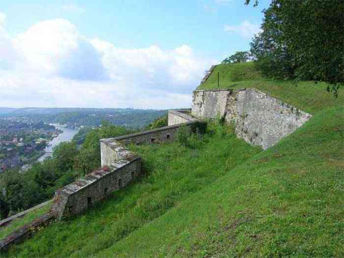 Overlooking the city of Namur, 123 m/asl, the provincial capital located at the confluence of the Meuse and the Sambre, the citadel is composed of three adjoining parts from different eras. There is the old count's castle which evolved from 937 to the 15th century, to which was added, beyond a ditch, the Médiane, a work with two bastions whose curtain wall of the head front has no detached organ and was built from 1542 onwards. In front of Médiane, the Dutch built, from 1631 to 1675, a vast bastioned fort which was named, after 1691, Terra Nova. This fort was separated from Médiane by a bastioned tenaille. Vauban made a few minor improvements, but focused mainly on the city's enceinte. During the 18th century, several detached works were developed in front of Terra Nova, such as Fort d'Orange (or Fort Guillaume, or also Fort Coehoorn), the forts Camus, Schwartzenberg, du Saint-Esprit, du Diable, the lunette Kykuyt, etc. King Leopold II pronounced the decommissioning of the citadel as a military place in July 1891. Note that in 1939, the command post of the Fortified Position of Namur established itself there in an old network of galleries that was carefully gunited. A device for slight overpressure was planned. Although outside the scope of this index, we allow ourselves to emphasize this truly singular command post which will astonish even the most seasoned of our readers.