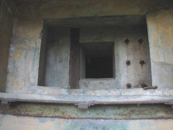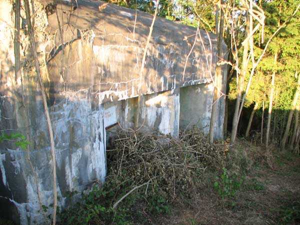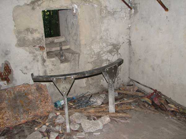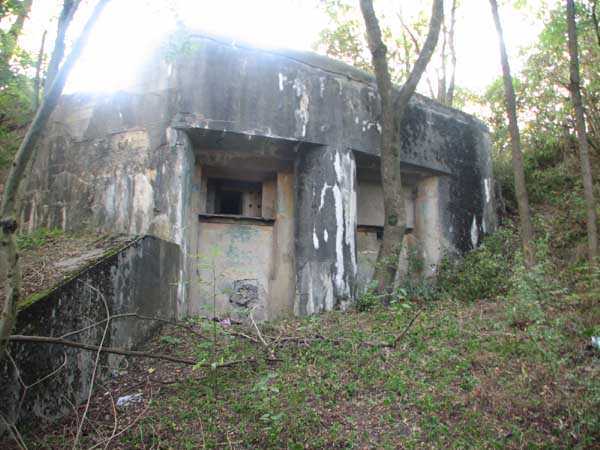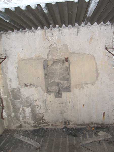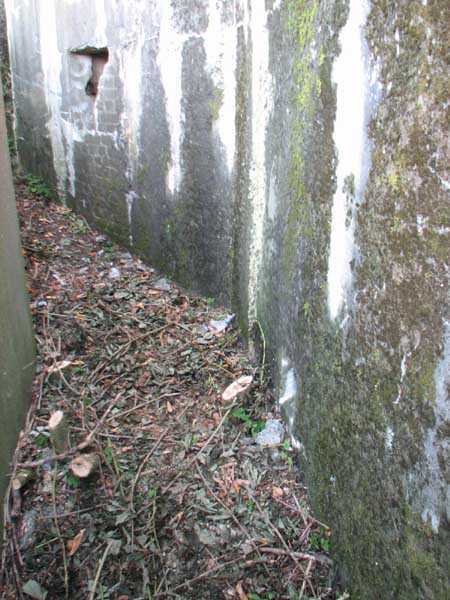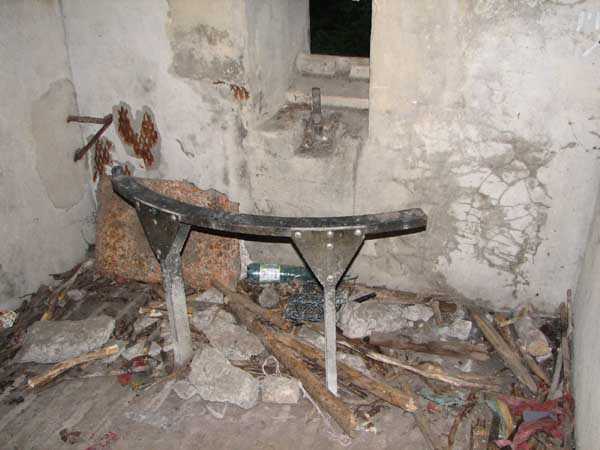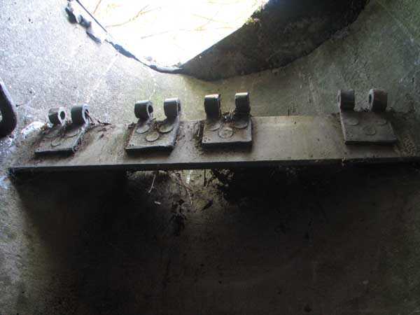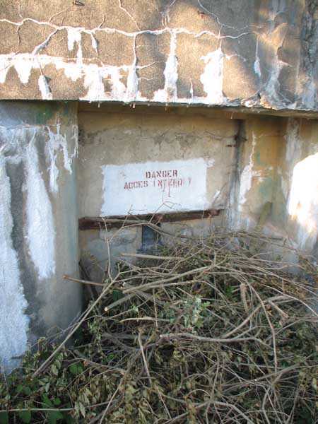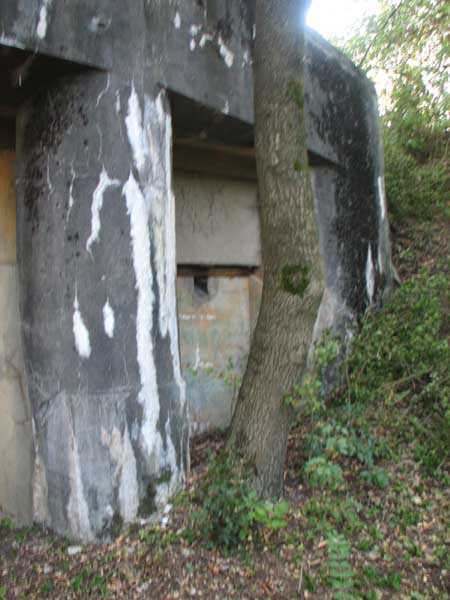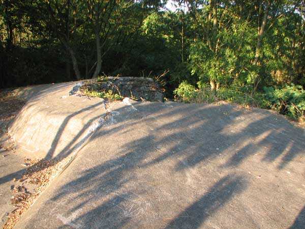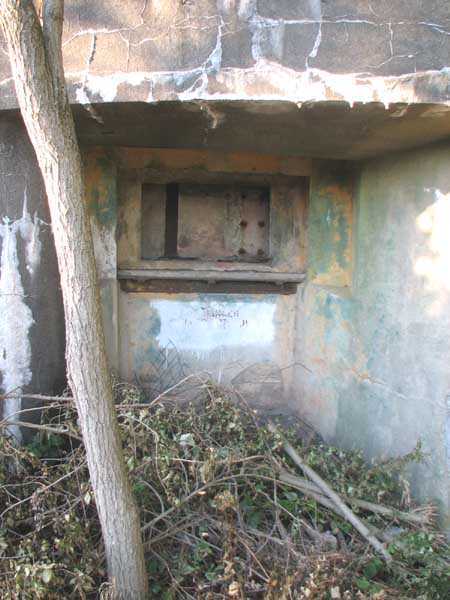 Fortified Position of Liège, second line of resistance, Chaudfontaine-Fléron interval, shelter CF4, 200 m/asl, located in Bouny on a 21 m high hillock from which it dominates all the surroundings, accessible by a path that climbs up there from the northern end of Rue Fond du Loup. It is a superb shelter with an original design, converted for 2 x 2 machine guns, a light machine gun for entrance defense, an observation cupola, torn off by scrap dealers who would have done better to do it elsewhere, and two grenade launcher chutes. The conversion modified two of the machine gun embrasures into additional grenade launcher chutes. Still present: the rungs in the cupola shaft, the consoles for shelves, some of which are bent, the L3 hooks for hanging individual weapons, the Chardôme mount supports as well as the axle, the frames of the closing flaps of the grenade launcher chutes, the door frames and hinges, the fixings for the hinges of the armored embrasure shutters and a significant part of the forced ventilation. During my visit in July 2006, the shelter served as a playground for the neighborhood children who accompanied me on the tour. The exterior and interior were clean and in good condition.