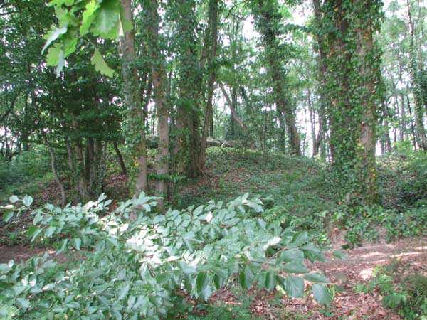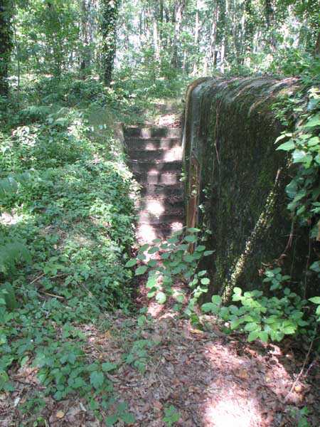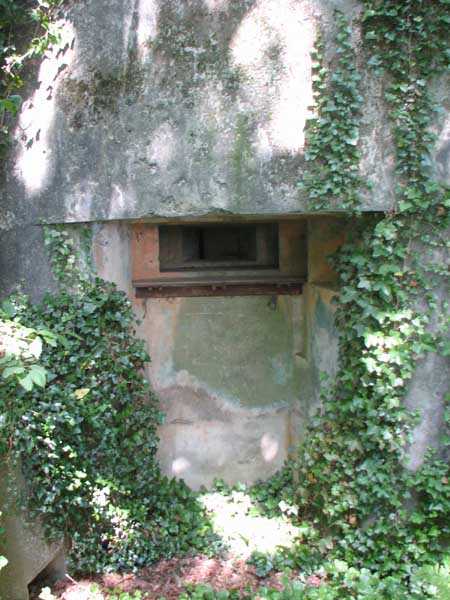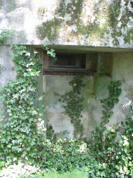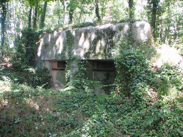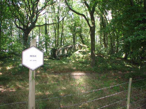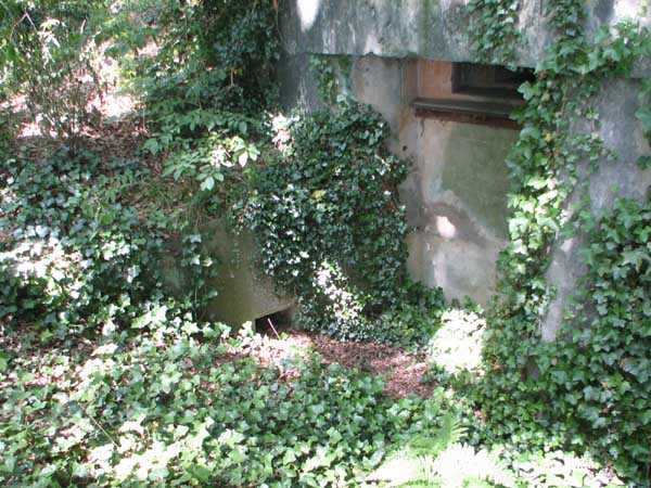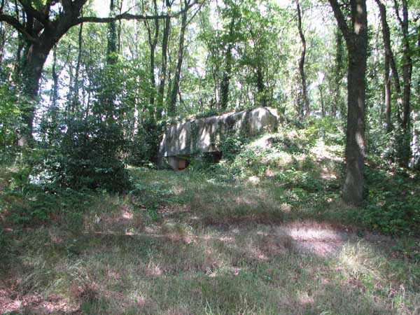 Fortified Position of Liège, second line of resistance, Chaudfontaine-Fléron interval, shelter CF2, located, as its name indicates, in the grove to the west where Rue de la Béôle forms an S, that is to the left when climbing towards Romsée. It is a very beautiful classic and unmodified shelter with two machine gun embrasures by the roadside and without a cupola. Very good condition in an enhancing setting and access forbidden.
