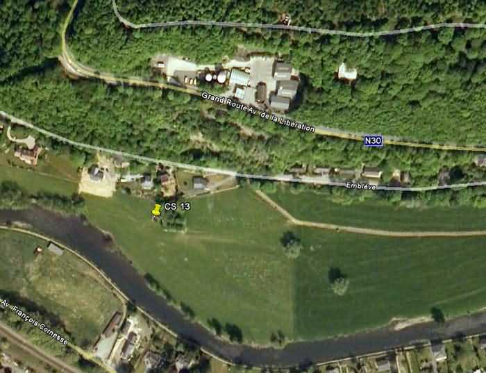 Belgische vestingen van de Tweede Wereldoorlog, Versterkte Stelling Luik, interval Comblain-Sougné van de eerste linie, schuilkelder CS13. Schuilkelders met een schietgat voor een Maxim-machinegeweer op sleeplaffet, het geheel gemonteerd op een Chardôme-inrichting. Gelegen 975 meter ten oosten van het centrum van de plaats Aywaille in een weide tussen de Rue de l'Emblève en de rechteroever van de rivier, is hij verborgen in een boomgroep. De toegang is wat moeilijk maar het geheel is in goede staat zowel buiten als binnen. Men vindt er nog de steun en de as van de Chardôme-affuit, de verticale PR-streep voor de wapeninstelling, de consoles van de planken en de diensthaken, de bevestigingsplaat voor de patroontrechter, de haken voor de bevestiging van de lampen, de granaatwerpgoot, die de ingang dekt, met zijn sluitklep, de afrasteringspalen en een DN-grenspaal die het militaire terrein afbakent.