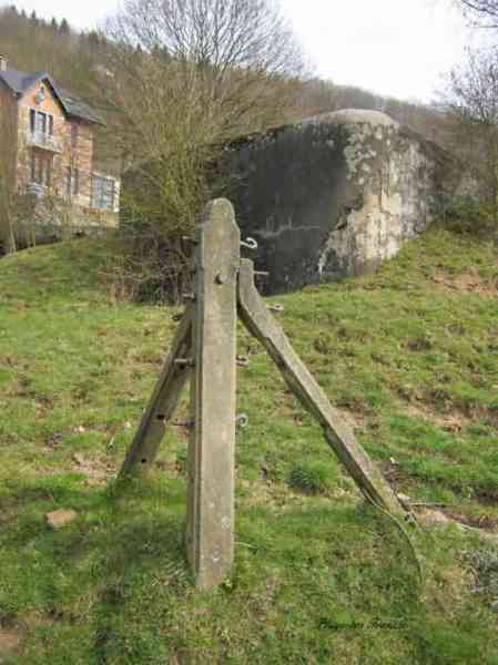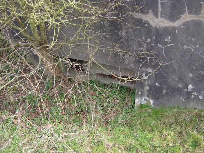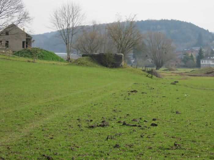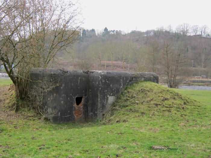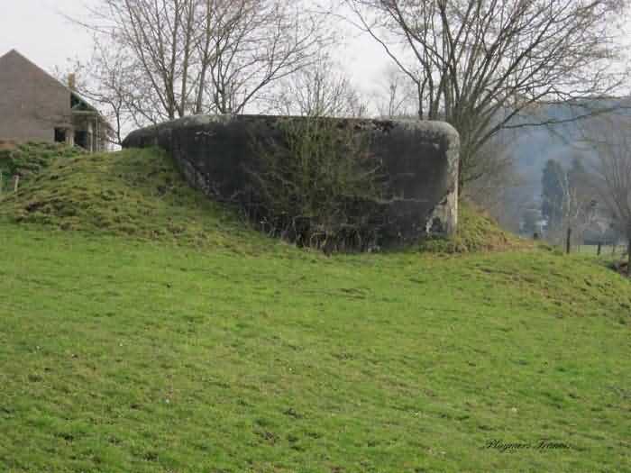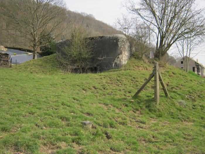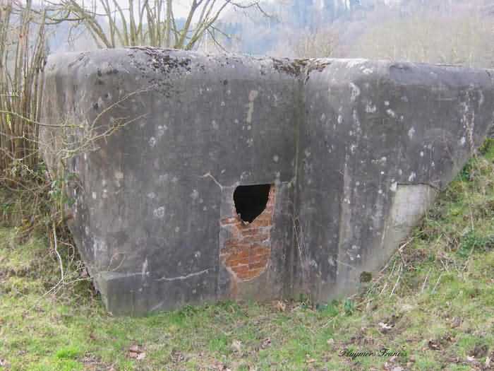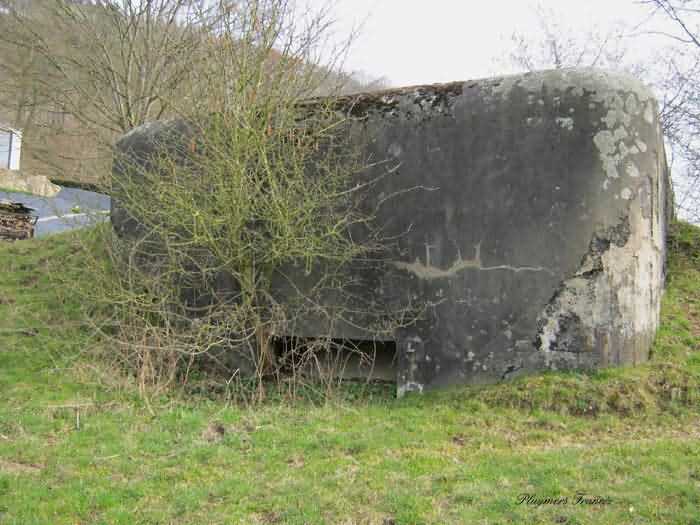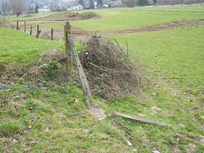 Belgian fortifications of the Second World War, Fortified Position of Liège, Comblain-Sougné interval of the first line, shelter CS13. Shelter with an embrasure for a Maxim machine gun on a sleigh mount, all mounted on a Chardôme device. Located 975 meters east of the center of the locality of Aywaille in a meadow between Rue de l'Emblève and the right bank of the river, it is hidden in a clump of trees. The entrance is a bit difficult but the whole is in good condition both externally and internally. One can still find the support and axle of the Chardôme mount, the vertical PR line for weapon adjustment, the shelf consoles and service hooks, the mounting plate for the cartridge hopper, the hooks for fixing the lamps, the grenade-launching chute, which covers the entrance, with its closing flap, the fence posts and a DN boundary stone delimiting the military terrain.