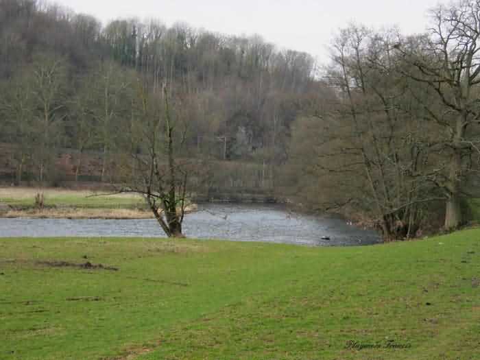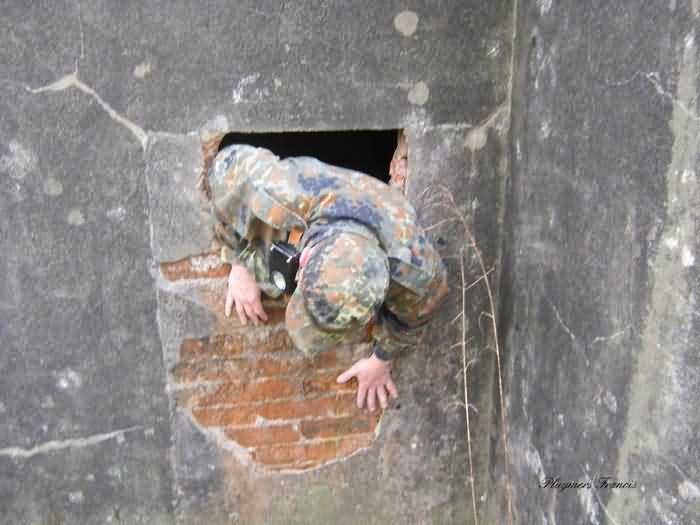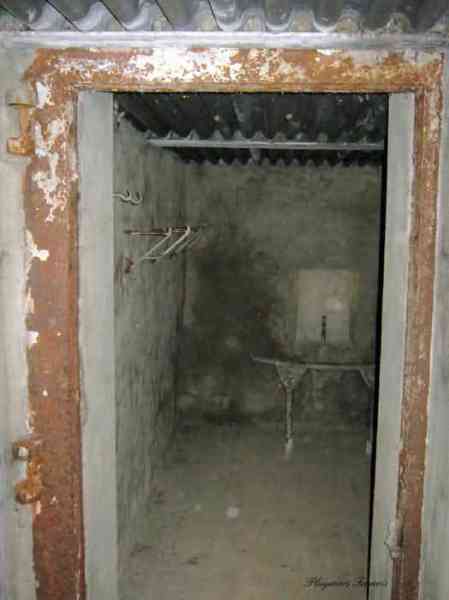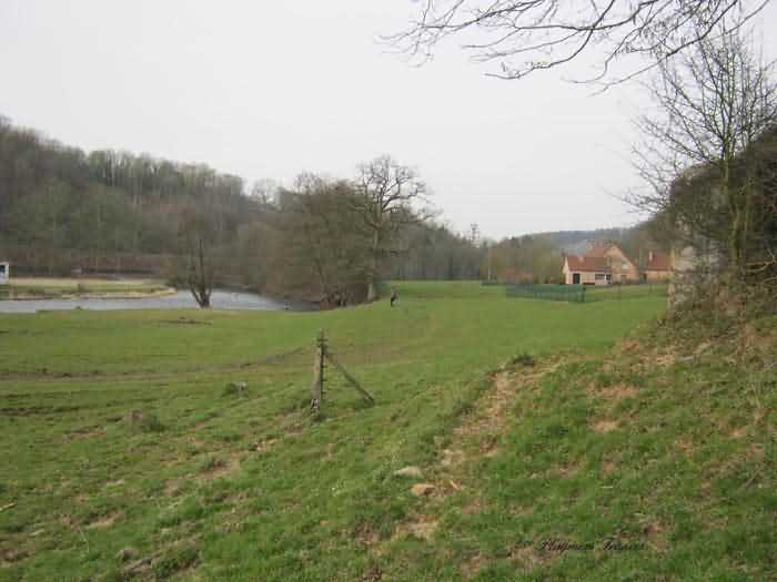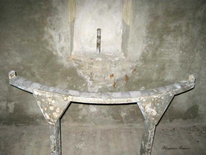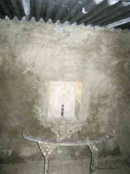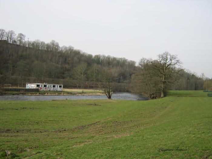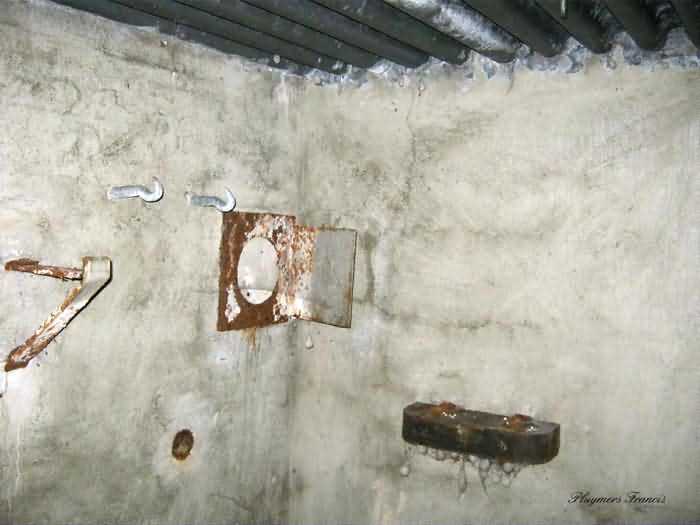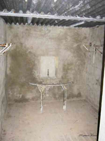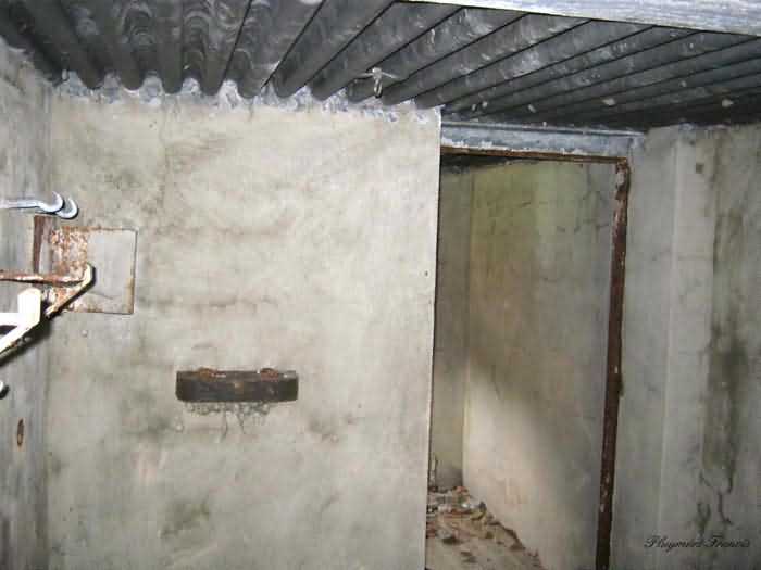 Belgian fortifications of the Second World War, Fortified Position of Liège, Comblain-Sougné interval of the first line, shelter CS13. Shelter with an embrasure for a Maxim machine gun on a sleigh mount, all mounted on a Chardôme device. Located 975 meters east of the center of the locality of Aywaille in a meadow between Rue de l'Emblève and the right bank of the river, it is hidden in a clump of trees. The entrance is a bit difficult but the whole is in good condition both externally and internally. One can still find the support and axle of the Chardôme mount, the vertical PR line for weapon adjustment, the shelf consoles and service hooks, the mounting plate for the cartridge hopper, the hooks for fixing the lamps, the grenade-launching chute, which covers the entrance, with its closing flap, the fence posts and a DN boundary stone delimiting the military terrain.