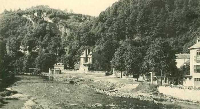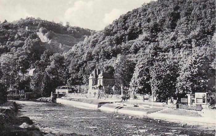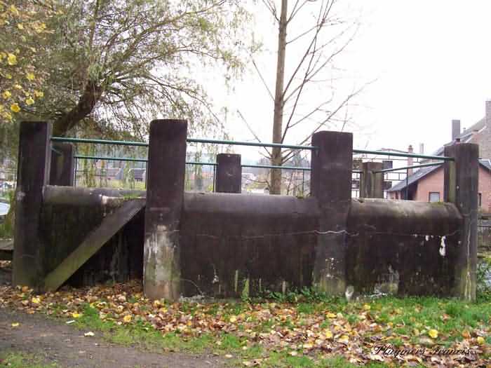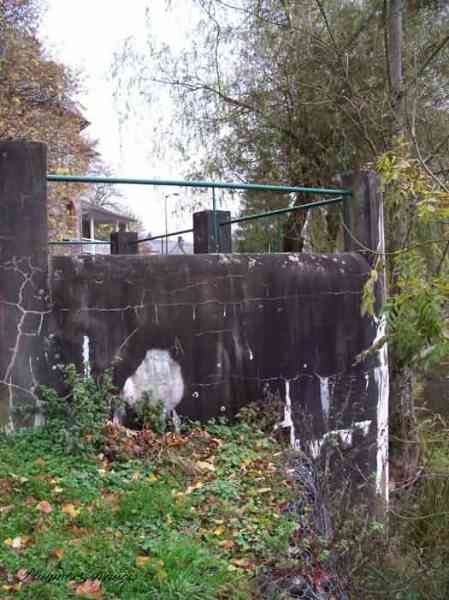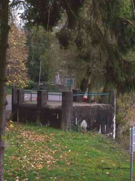 Belgian fortifications of the Second World War, Fortified Position of Liège, Comblain-Sougné interval of the first line, shelter CS15 with an embrasure for a Maxim machine gun on a sleigh mount and Chardôme device. Located 415 meters north of the center of the locality of Aywaille on the bank of the Ambléve below Rue de la Brassine and 75 meters west of CS14, it is in good condition but its openings are walled up. It is camouflaged as a terrace and old views show that the ground was higher at the time.
