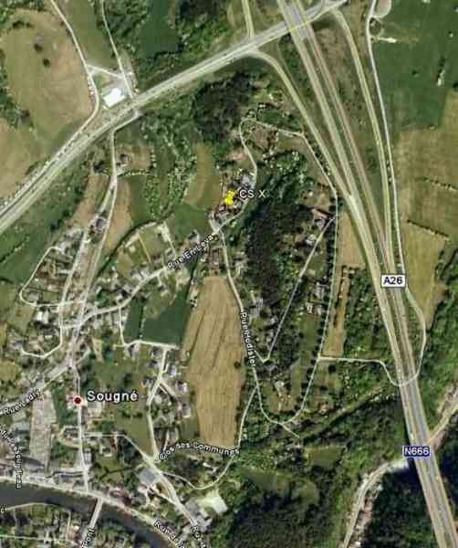 Belgické opevnění z druhé světové války, Opevněná pozice Lutych, interval Comblain-Sougné první linie, bunkr CS X se střílnou pro kulomet Maxim na saních lafetě a zařízení Chardôme. Na soukromém pozemku slouží jako základ pro terasu domu, ačkoli je nepřístupný, stále existuje. Díky vlastníkům, že nám umožnili pořídit několik fotografií.