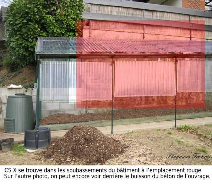 Fortifications belges de la seconde guerre mondiale, position fortifiée de Liège, intervalle Comblain-Sougné de la première ligne, abri CS X avec un créneau pour une mitrailleuse Maxim sur affût traîneau et dispositif Chardôme. Dans une propriété privée, il sert de soubassement à la terrasse de la maison mais bien qu'inaccessible il existe encore. Merci aux propriétaires de nous avoir permis de faire quelques photos.
