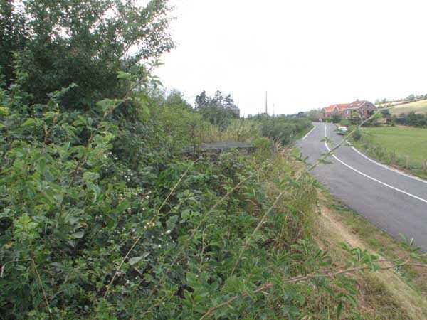 Belgian fortifications of the Second World War, fortified position of Liège, first line of defense, advanced position of Dolhain, shelter A of type PA model B, 247 m/asl, 3 men. Shelter A of Goé-Hèvremont is located 800 meters from the church of Goé on the road to Hèvremont, in the left embankment at the first bend. Embrasure and entrance are below the level of the filled earth but the emerging part seems to be in good condition.