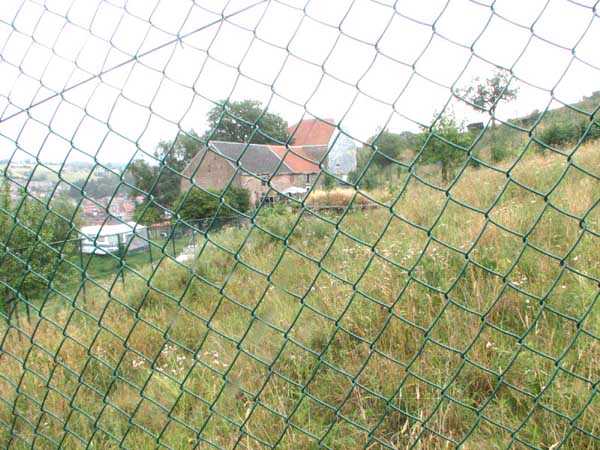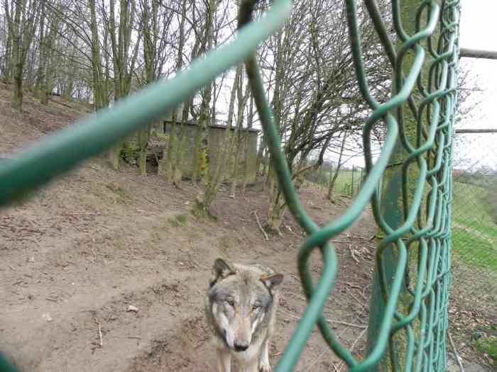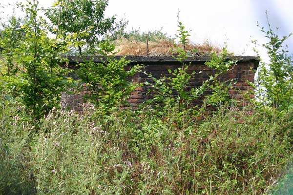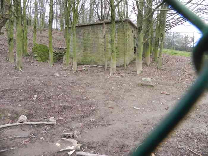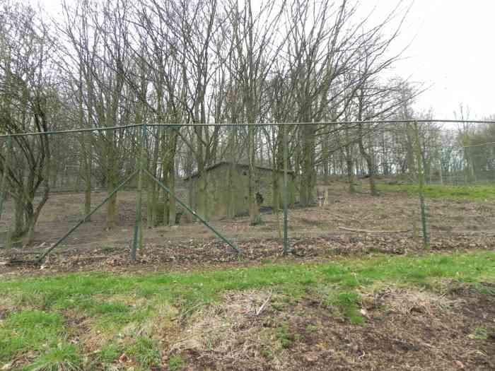 Belgian fortifications of the Second World War, fortified position of Liège, first line of defense, advanced position of Dolhain, shelter I of type PA model A, 242 m/asl, 3 men. Shelter I of la Moutarde is located in a wolf enclosure on private property with limited access. A brick facing covers at least three sides of the shelter, the fourth could not be seen. It was not possible to enter or approach the shelter but at a distance of about ten meters it seems slightly dilapidated. We will try to approach it when the canine occupants of the place are elsewhere…