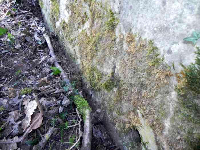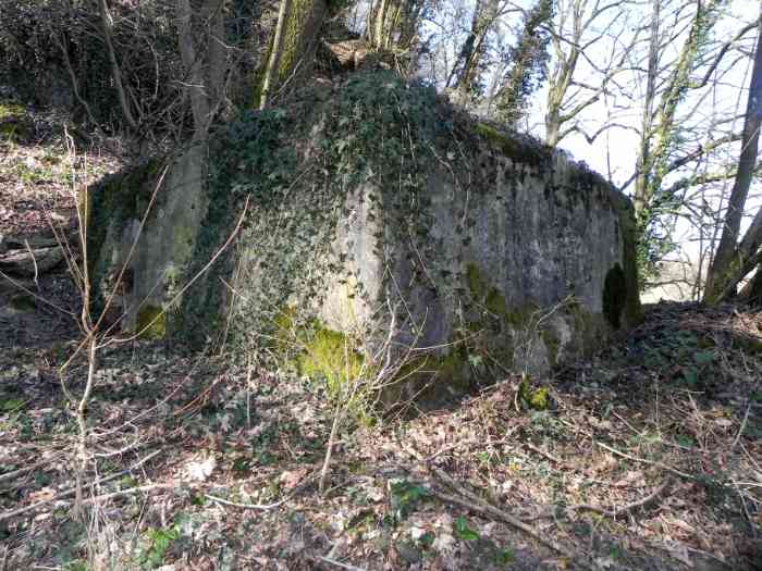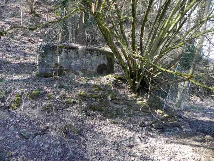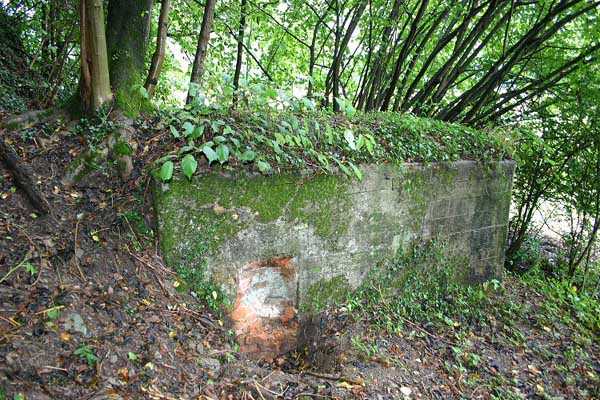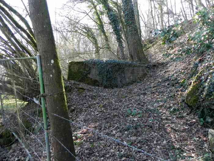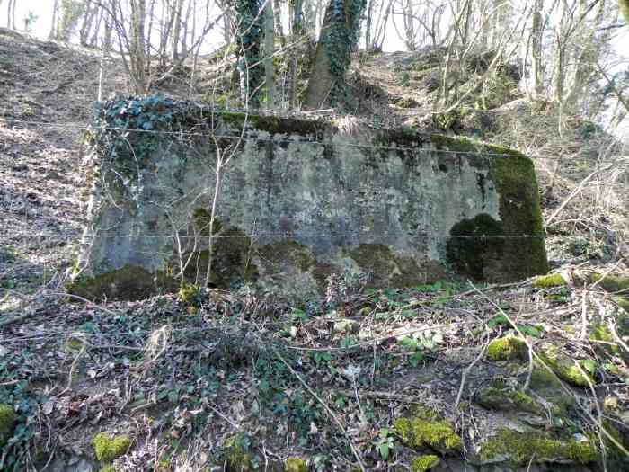 Belgian fortifications of the Second World War, fortified position of Liège, first line of defense, advanced position of Dolhain, shelter L of type PA model D, 247 m/asl, 3 men. The small fort L of Bellevaux is located 250 meters from the bridge of the same name when leaving Dolhain for Verviers via les Surdents. It monitors the entire sanatorium sector and practically has its feet in the Vesdre. Externally it does not seem to have suffered artillery hits but all openings are walled up although someone recently tried to open the entrance door side. The interior condition is currently unknown. To get there, there is a long and peaceful way via the sanatorium bridge, the farm and then the meadow; and a short and dangerous way by climbing the embankment that borders the Vesdre from the Bellevaux bridge.