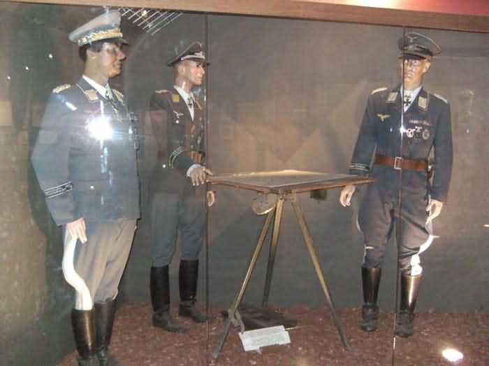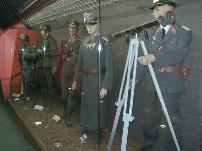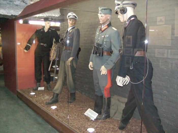 Fortifications belges de la seconde guerre mondiale, première ligne de défenses de Liège, position fortifiée de Liège, fort d'Eben-Emael, sous-sol. Taillé dans la marne et le tuffeau, le sous-sol du fort d'Eben-Emael a le grand avantage d'être relativement sec en comparaison à la plupart des autres forts belges. Le creusement des galeries et locaux souterrains ne nécessitait pas d'outillage lourd ni de structures de consolidation encombrantes. Deux grandes galeries pour camions permettaient d'évacuer les déblais par péniches sur le canal Albert sans trop éveiller l'attention de l'ennemi sur l'importance des travaux en cours. Le fort dispose encore de toutes ses armes lourdes, de quelques armes légères, des dispositifs de pompage, des accessoires de ventilation, des chariots de transport pour l'eau et pour les munitions, des monte-charges et de l'ascenseur. Une importante partie des locaux de la caserne souterraine a été remise en état. L'hôpital et ses dépendances ont été reconstitués sur la base des photographies de l'époque. La cuisine a été convertie en cafétéria et les locaux attenants en musée. Le musée contient de nombreuses pièces fort intéressantes, certaines très rares et de grande valeur.