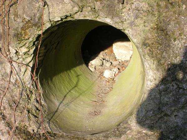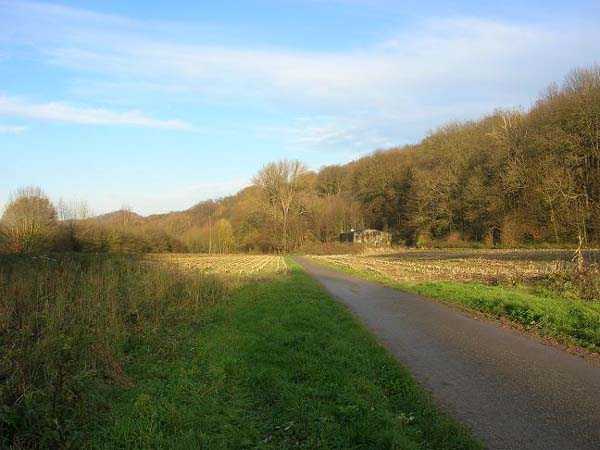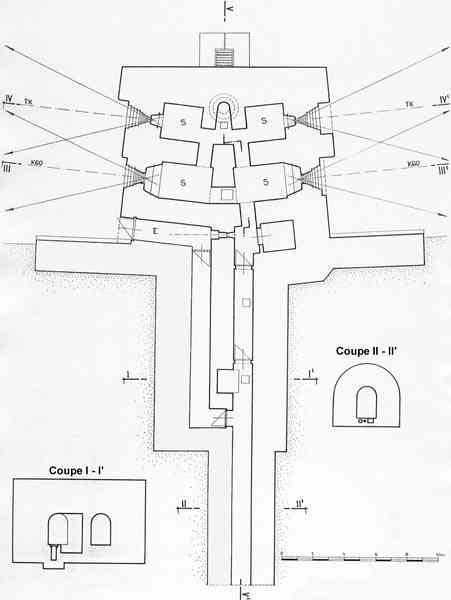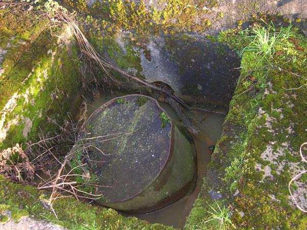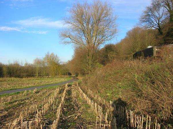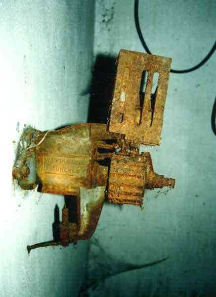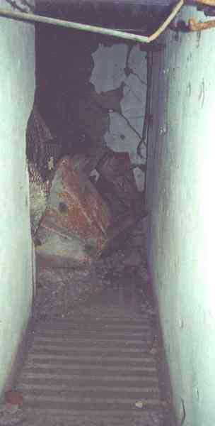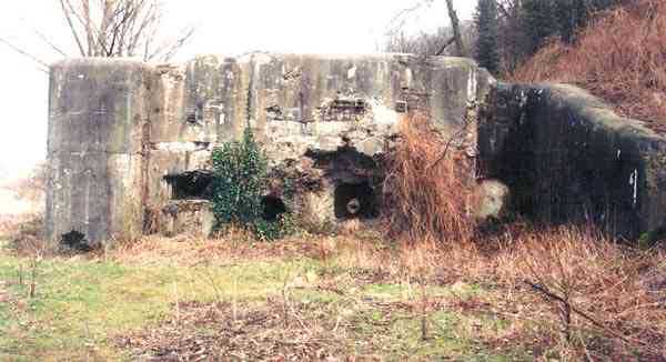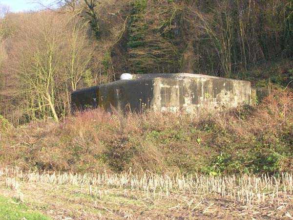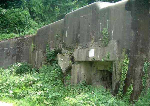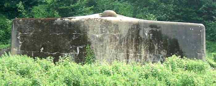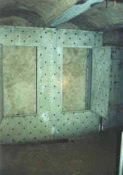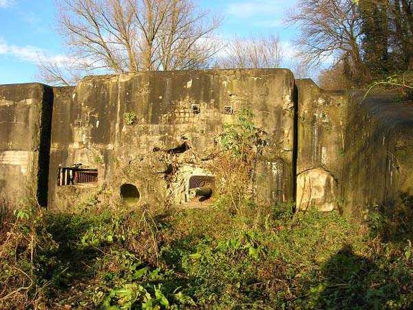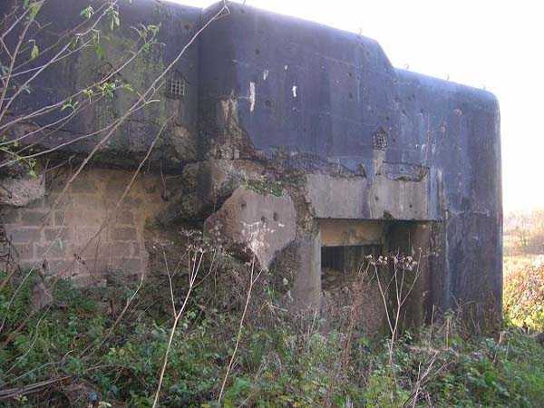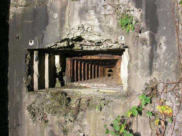 Belgian fortifications of the Second World War, first line of the fortified position of Liège, fortified position of Liège, fort of Eben-Emael, block 2. Block 2, like block 1, also fulfills multiple functions. It is a counterscarp infantry casemate that was formerly called a caponier. It provides flanking coverage towards block 1 with a machine gun, a later added armored 30 cm projector, and a 60 mm gun. On the same facade, it has a second entrance for infantry only, chicane and covered by a light machine gun. The gallery leading into the fort also has two decontamination rooms which, as for block 1, allow any victims of a combat gas attack to shower and change clothes. On the opposite facade, it has a machine gun, a 60 mm gun and an embrasure for a later added armored 30 cm projector. It should be noted that all the firing chambers of this block are arranged on a single level, flush with the ground, and that despite very compact dimensions, it nevertheless has two 60 mm guns, two heavy machine guns, two armored 30-centimeter projectors and an observation cloche (ZP). We have several versions of the construction plans for this block except for the final version. The last available plan shows walls with increased thickness but no projector. The structure itself has a projector illuminating towards block I as well as a projector illuminating the Geer ditch. The interior of block 2 is rather ravaged by one or more violent explosions. A heavy armored door is torn off and lying across the corridor giving access to the combat rooms. The top of block 2 is occupied by a small observation cloche (ZP), similar to that of block 1 or 5, which allows observation of the surroundings through a narrow slit but does not allow the use of a weapon. The two destroyed guns are still in place, as is a device, eaten away by rust and time, used to put new cartridges into machine gun belts.