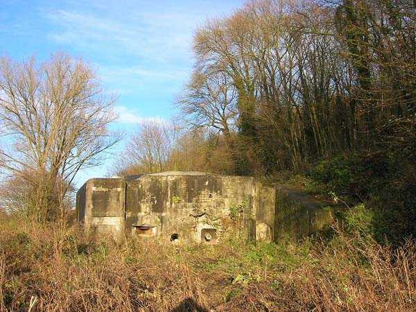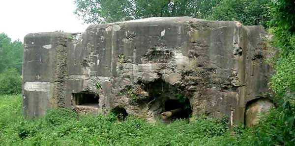 Fortifications belges de la seconde guerre mondiale, première ligne de défenses de Liège, position fortifiée de Liège, fort d'Eben-Emael, bloc 2. Le bloc 2, comme le bloc 1 assure également des fonctions multiples. Il s'agit d'une casemate d'infanterie de contrescarpe que l'on nommait avant caponnière. Elle assure le flanquement en direction du bloc 1 avec une mitrailleuse, un phare cuirassé de 30 cm ajouté tardivement et un canon de 60 mm. Sur la même façade, il dispose d'une seconde entrée d'infanterie uniquement, chicanée et battue par un fusil-mitrailleur. La galerie menant dans le fort dispose également de deux locaux de décontamination qui comme pour le bloc 1 permettent aux éventuelles victimes d'une attaque au gaz de combat de se doucher et de changer de vêtements. Sur la façade opposée, il dispose d'une mitrailleuse, d'un canon de 60 mm et d'une embrasure pour projecteur cuirassé de 30 cm ajouté tardivement. Il est à noter que toutes les chambres de tir de ce bloc sont disposées sur un seul niveau, au ras du sol et que malgré des dimensions très compactes, il dispose pourtant de deux canons de 60 mm, de deux mitrailleuses lourdes, de deux phares cuirassés de 30 centimètres et d'une cloche de guet. Nous disposons de plusieurs versions des plans de construction de ce bloc sauf de la version définitive. Le dernier plan disponible présente des murs dont l'épaisseur a été augmentée mais aucun phare. La construction, elle, dispose d'un phare éclairant vers le bloc I ainsi que d'un phare éclairant le fossé du Geer. L'intérieur du bloc 2 est plutôt ravagé par une ou des explosions violentes. Une lourde porte blindée est arrachée et en travers du couloir qui donne accès aux locaux de combat. Le sommet du bloc 2 est occupé par une petite cloche de guet semblable à celle du bloc 1 ou 5 qui permet l'observation des environs par une étroite fente mais qui ne permet pas l'usage d'une arme. Les deux canons, détruits, sont toujours en place de même qu'un appareil, rongé par la rouille et par le temps, servant à mettre des cartouches neuves dans des rubans de mitrailleuse.