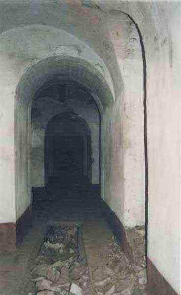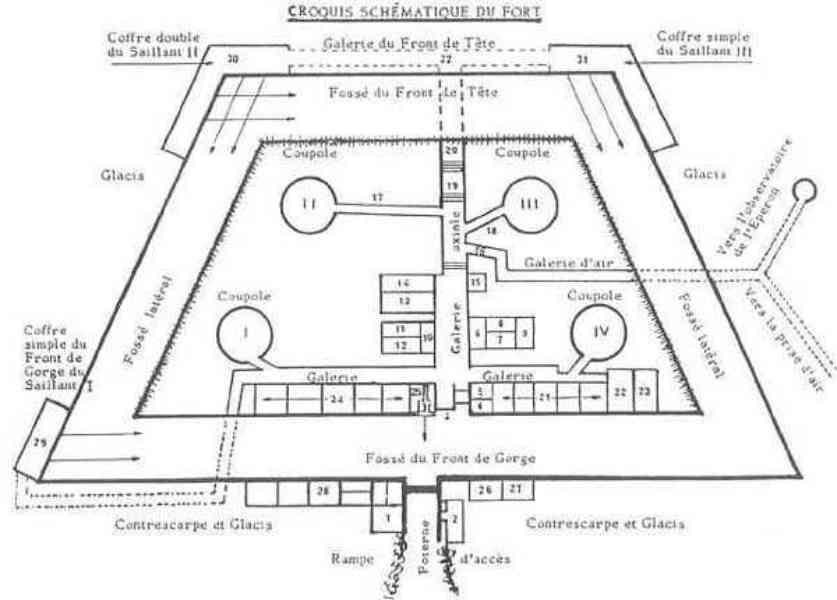 The 75 mm howitzer disappearing cupola is established in a reinforced concrete tower, reinforced at the upper part by a neck armor. The neck armor consists of three hardened cast iron voussoirs embedded in the concrete and fixed on foundation plates by means of keys and assembled together by studs. The tower is divided into two levels: the firing chamber and the lower level separated by a floor. The floor, placed on beams built into the tower wall, is pierced by a trapdoor. At this trapdoor ends a ladder fixed to the wall by which one accesses from the lower level to the firing chamber. The space between the voussoirs and the upper part of the tower wall is fitted with ten ammunition chests comprising one hundred and fifty cells for the neck armor cupolas of the "Grusonwerk" type. The 75 mm howitzer cupola comprises the following main parts: