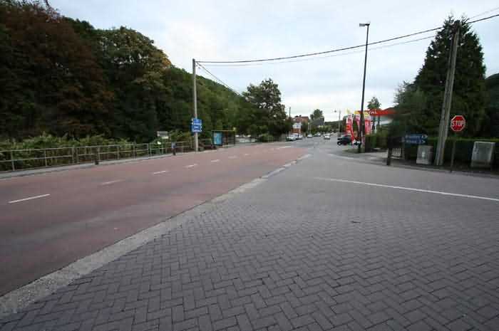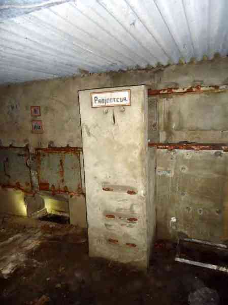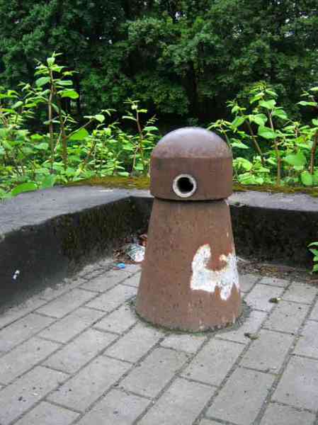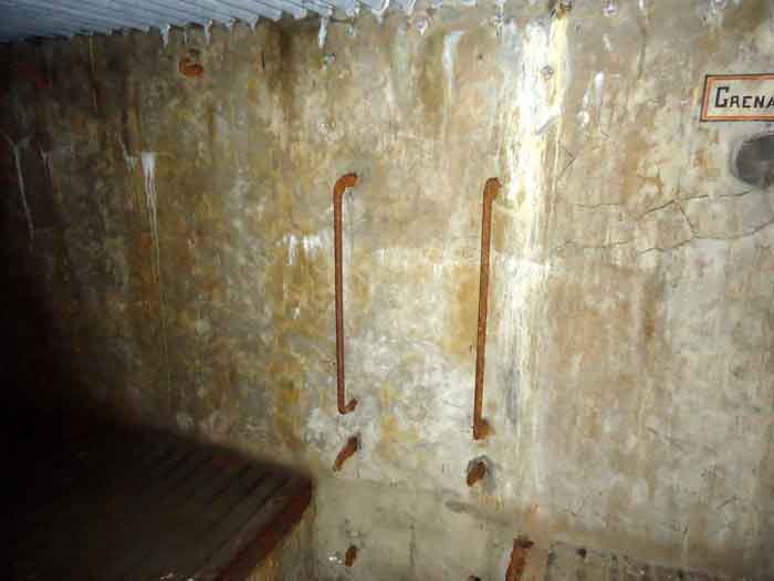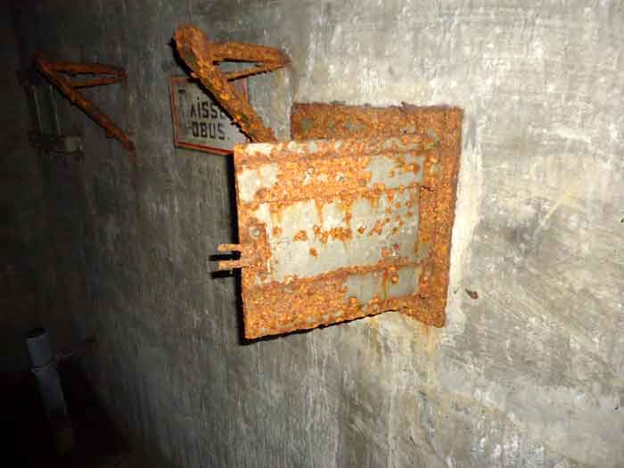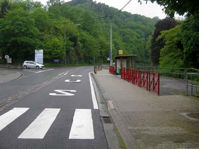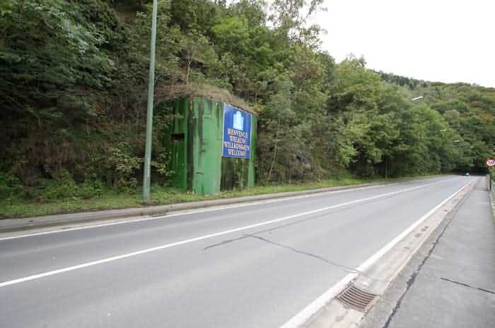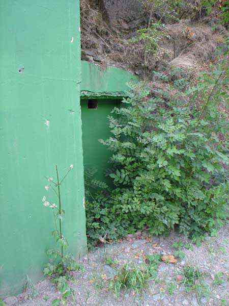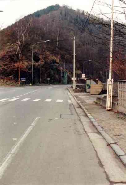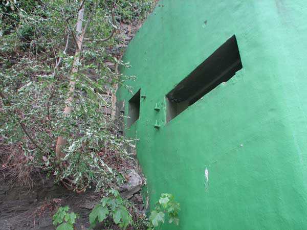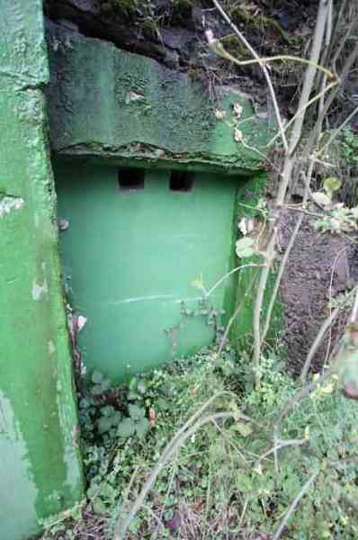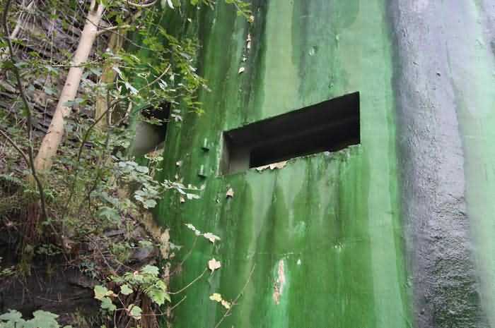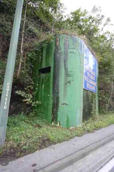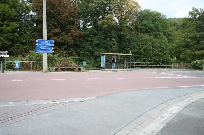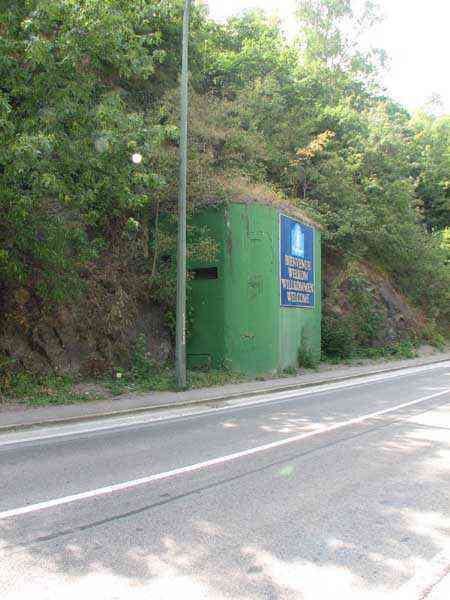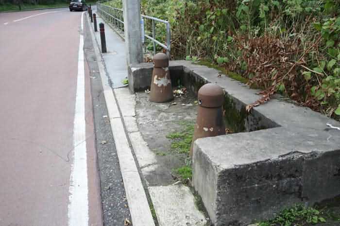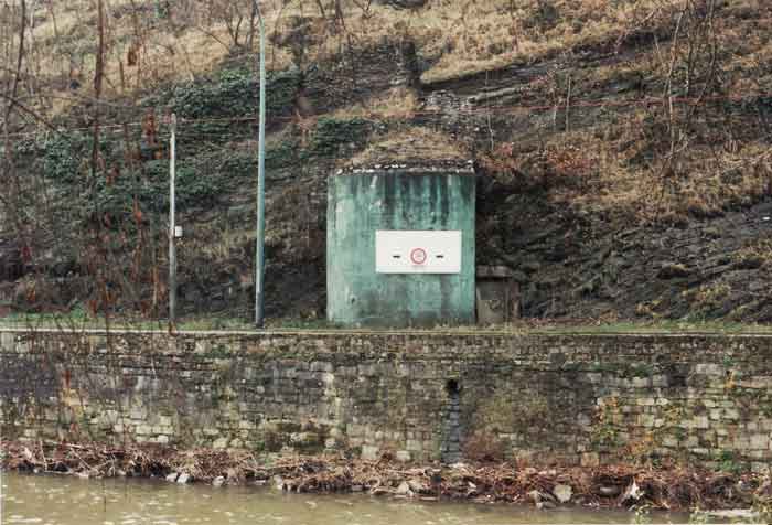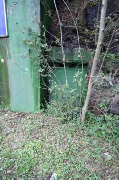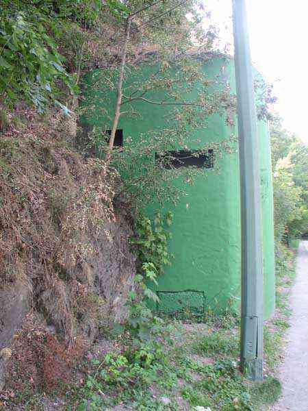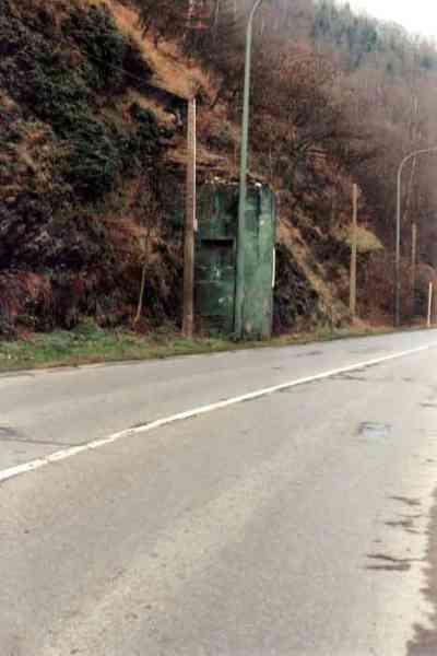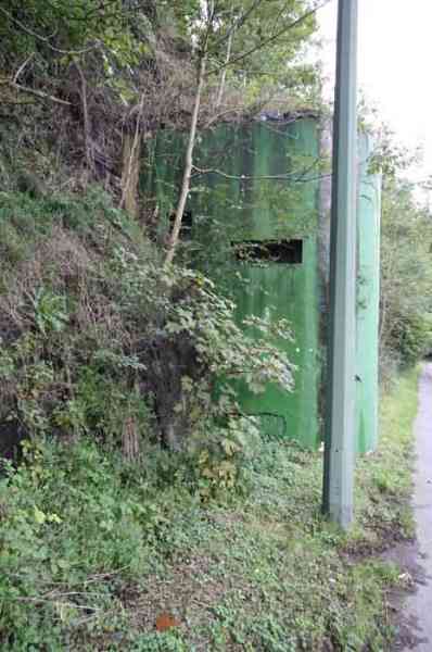 Fortified Position of Liège, second line of resistance, Embourg-Chaudfontaine interval, interval shelter EC2 of the counter-assault type with two levels, is located along the N61 road at the exit of Chaudfontaine when going towards Liège and monitors and blocks this exit. It comprises on the ground floor the entrance, a 47 mm gun on casemate mount and the emergency exit and, on the upper floor, a machine gun and a searchlight (a first of the "Magondeau" type = oxy-acetylene torch heating a thorium pellet – replaced in 1939 by a projector of the "Willock-Bottin" type = electric + storage batteries – following the connection of the shelter to the civilian electrical network by an underground 110 V cable). A particular feature, a corridor along the rear face of the shelter leads to the entrance airlock. This was done to protect the airlock entrance from possible falling rock fragments. In front of the shelter, a few cable terminals and a type C (Cointet) barrier base remain. But the interest lies in the conservation of garage C which also comprised the shelter's guardroom. This garage is cantilevered over the Vesdre and today has allowed the construction of a bus shelter. © Emile Coenen †