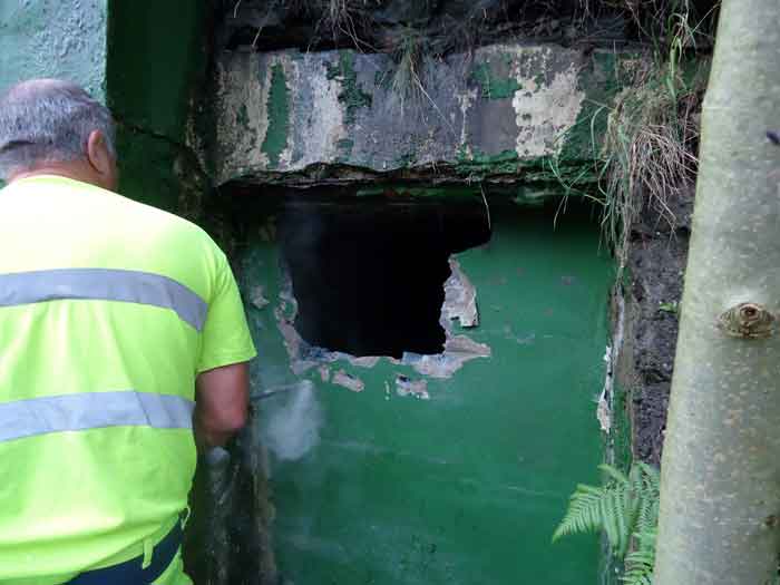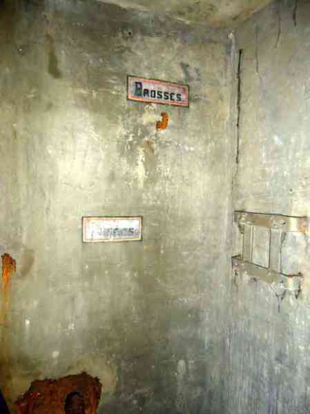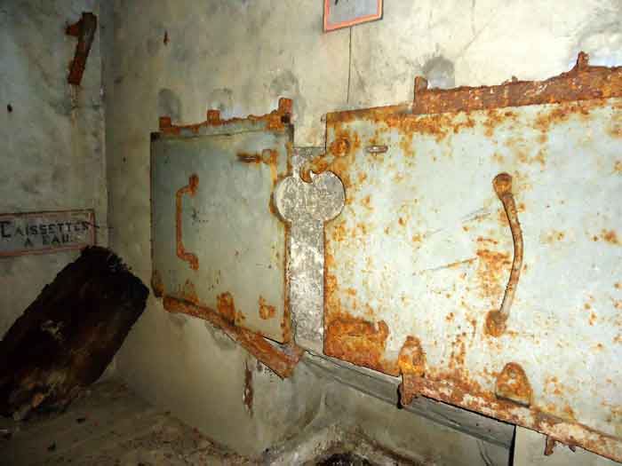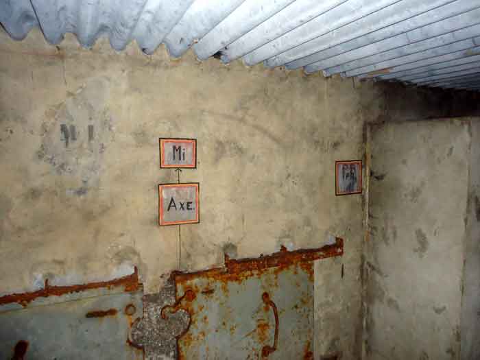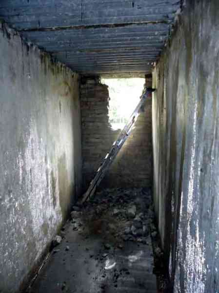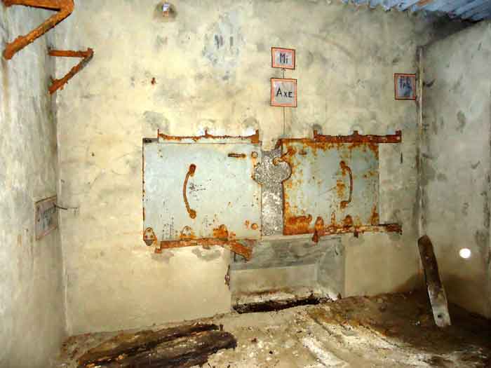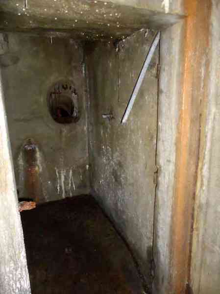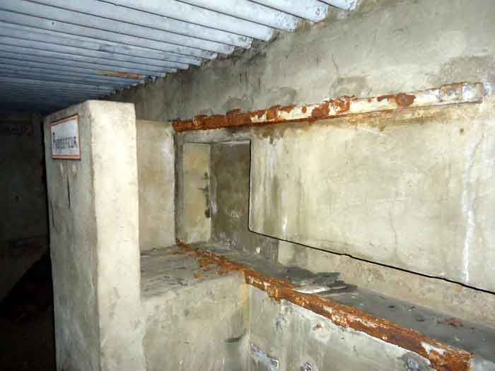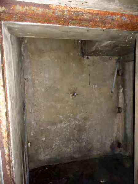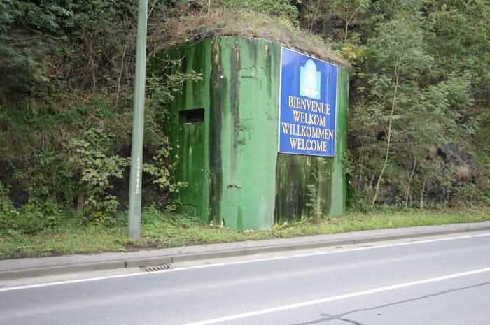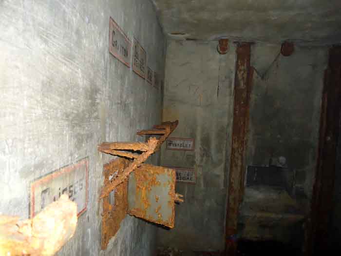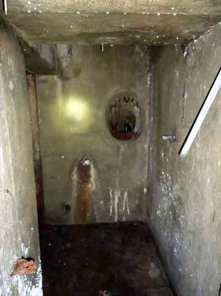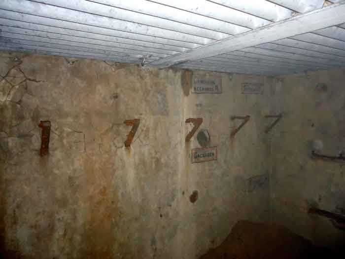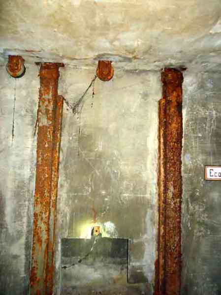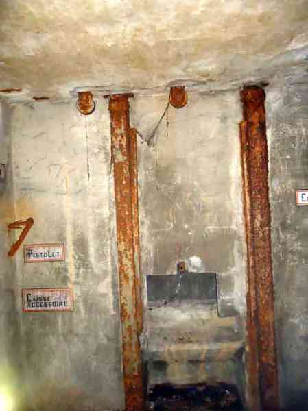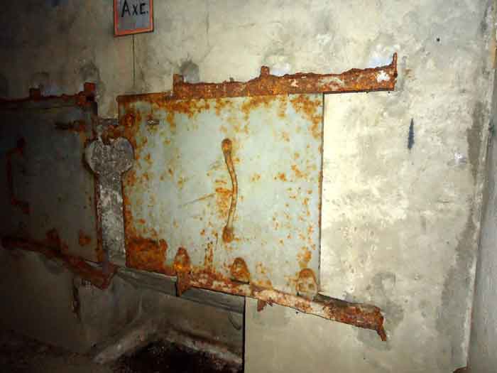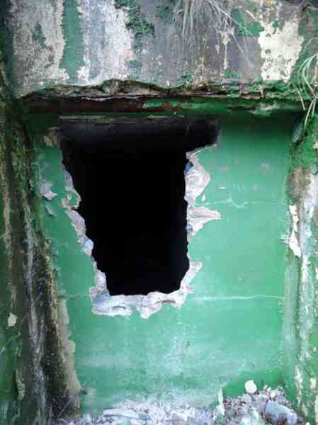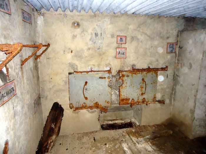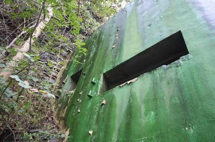 Fortified Position of Liège, second line of resistance, Embourg-Chaudfontaine interval, interval shelter EC2 of the counter-assault type with two levels, is located along the N61 road at the exit of Chaudfontaine when going towards Liège and monitors and blocks this exit. It comprises on the ground floor the entrance, a 47 mm gun on casemate mount and the emergency exit and, on the upper floor, a machine gun and a searchlight (a first of the "Magondeau" type = oxy-acetylene torch heating a thorium pellet – replaced in 1939 by a projector of the "Willock-Bottin" type = electric + storage batteries – following the connection of the shelter to the civilian electrical network by an underground 110 V cable). A particular feature, a corridor along the rear face of the shelter leads to the entrance airlock. This was done to protect the airlock entrance from possible falling rock fragments. In front of the shelter, a few cable terminals and a type C (Cointet) barrier base remain. But the interest lies in the conservation of garage C which also comprised the shelter's guardroom. This garage is cantilevered over the Vesdre and today has allowed the construction of a bus shelter. © Emile Coenen †