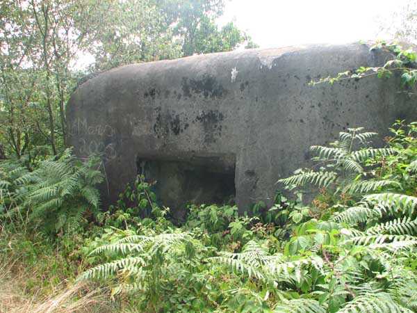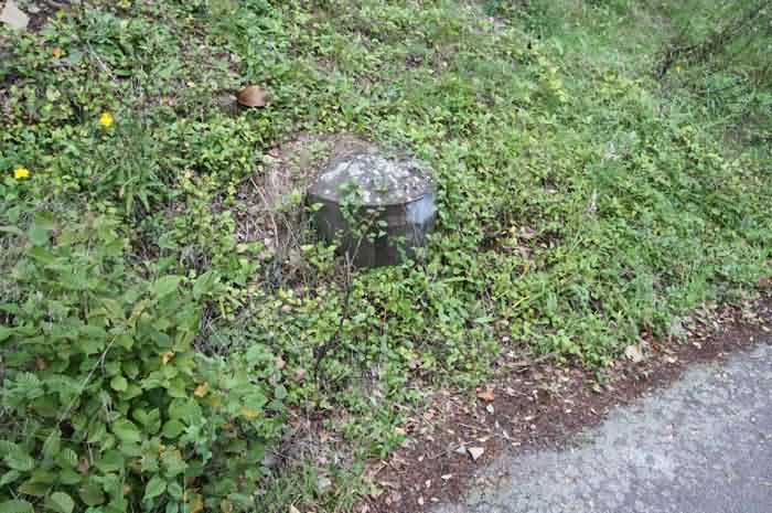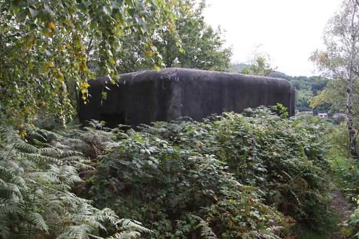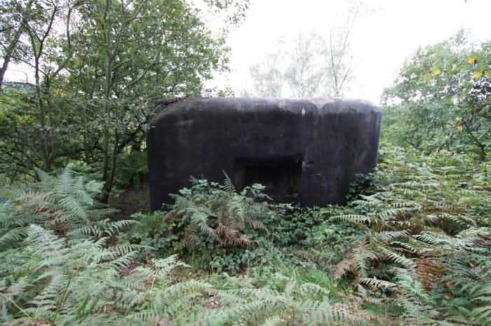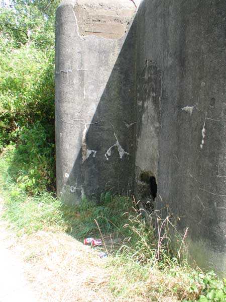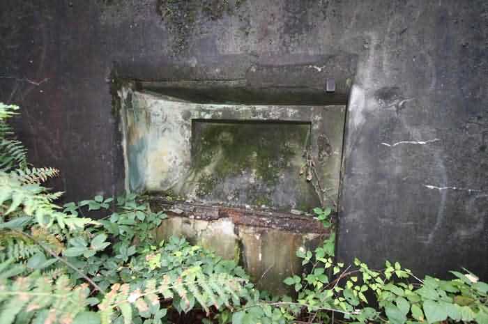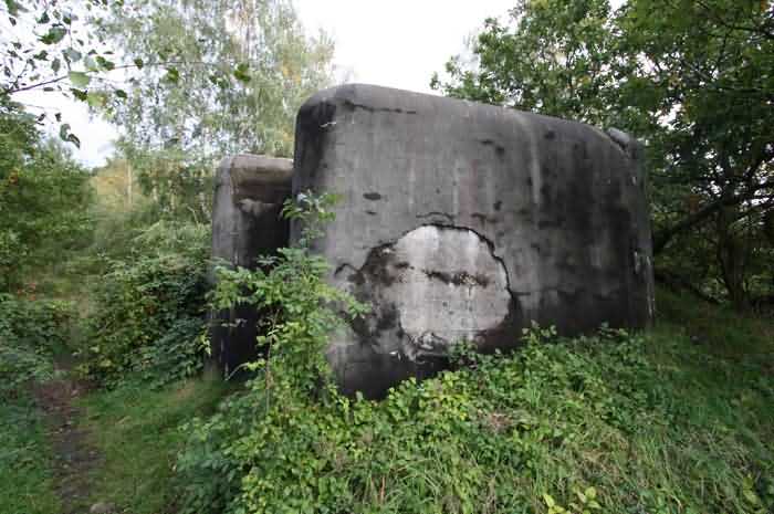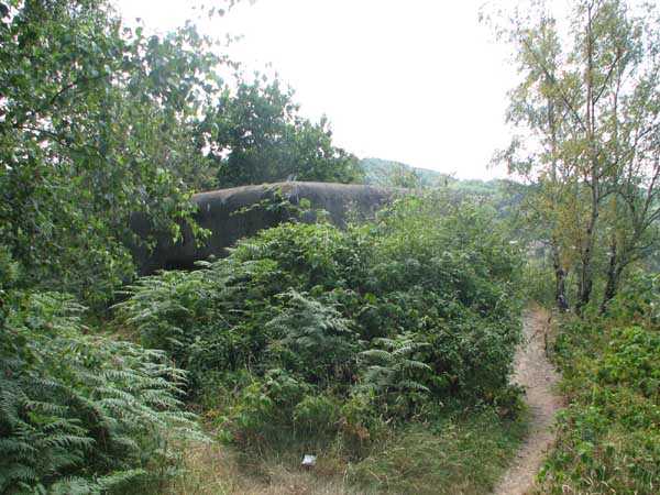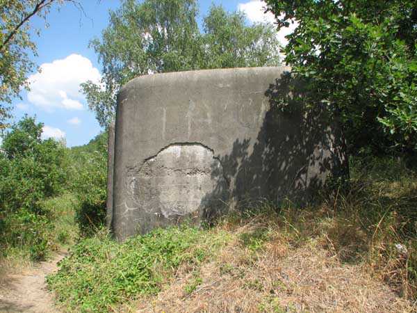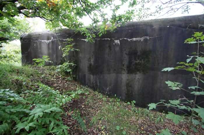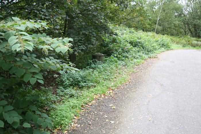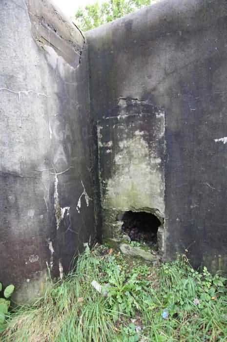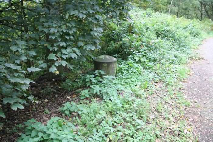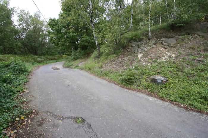 Fortified Position of Liège, second line of resistance, Embourg-Chaudfontaine interval, interval shelters. Interval shelter EC3 is located on the climb towards the fort of Chaudfontaine passing behind the casino. Here too it is an atypical shelter with a single embrasure but this time with only one level. The walled-up entrance has been partially opened but it is hardly inviting. 75 meters before the shelter there are two C-type barrier bases still visible, one on each side of the road, and a recess made in the rock bordering the Chemin de la Lemmeterie. It is actually the garage for the two C-type barriers. Also, a small path, leading towards the air intake, starts between the shelter and the barrier bases. This path is the old relief path for the fort's garrison. © Emile Coenen †